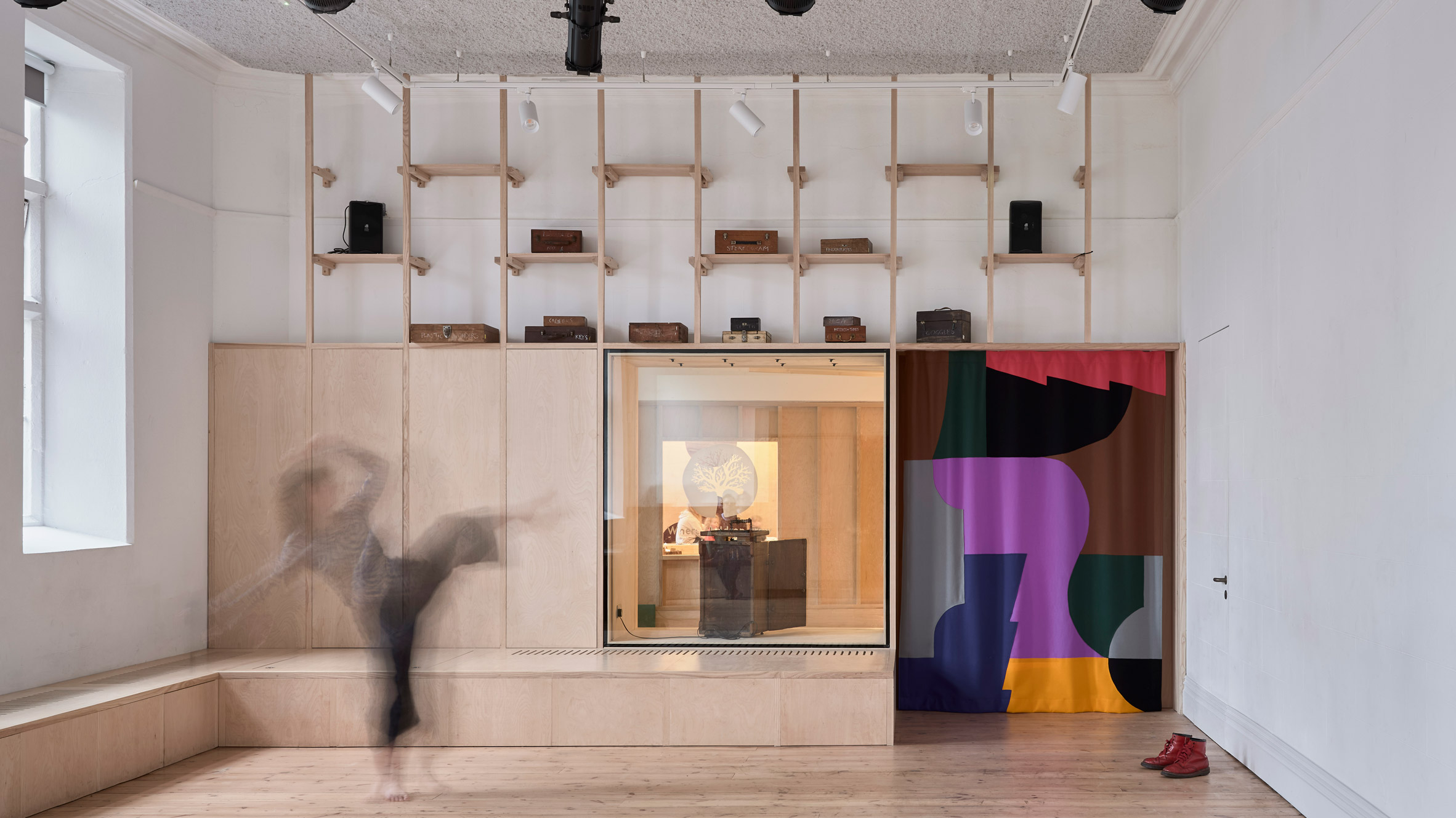 Uma janela acústica permite que este espaço funcione como um estúdio de gravação para uma área de performance adjacente envolta por cortinas e painéis de plástico reciclado, enquanto em frente uma sala de coworking é organizada em torno de uma grande mesa azul.