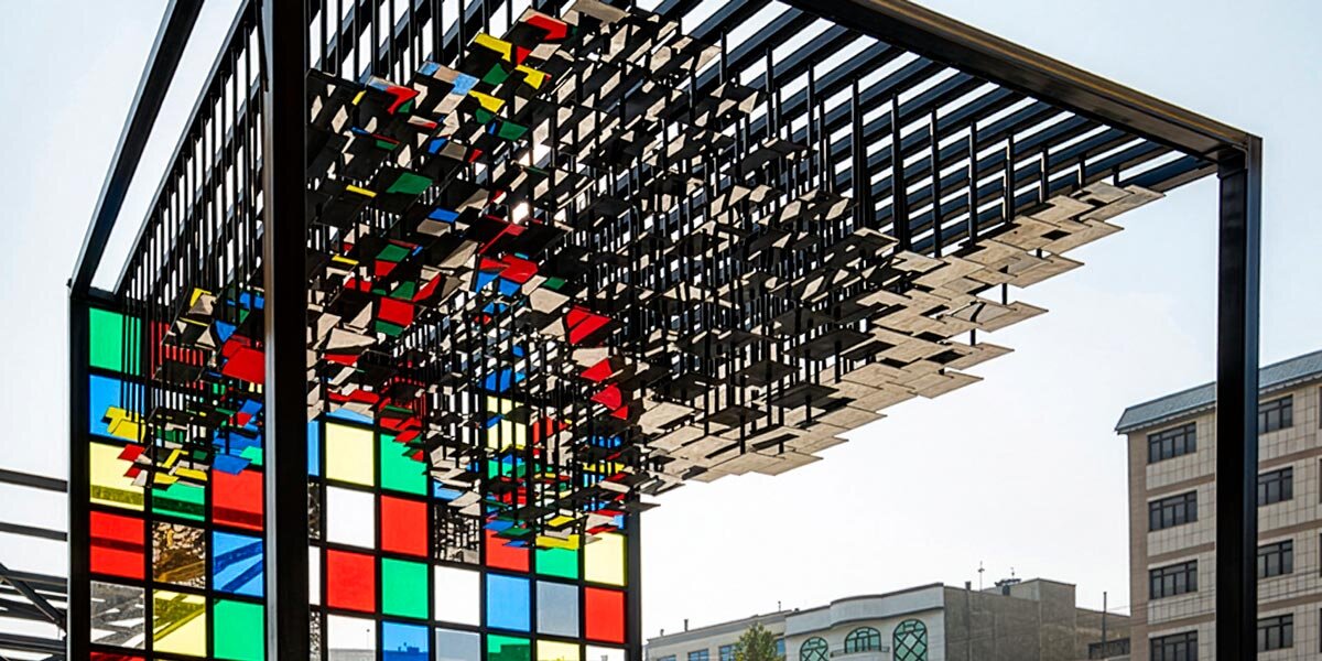 Encomendado em 2020 pelo município de Mashhad, o pavilhão está localizado dentro de uma antiga fábrica da Coca-Cola em Mashhad, agora reaproveitado como um centro de inovação. A intervenção ocupa um vazio cúbico dentro de um salão hipostilo piramidal maior, formado pela ausência de um módulo estrutural. O projeto responde a este contexto introduzindo uma estrutura cúbica autoportante que estabelece uma clara distinção espacial da estrutura circundante do início do modernismo.