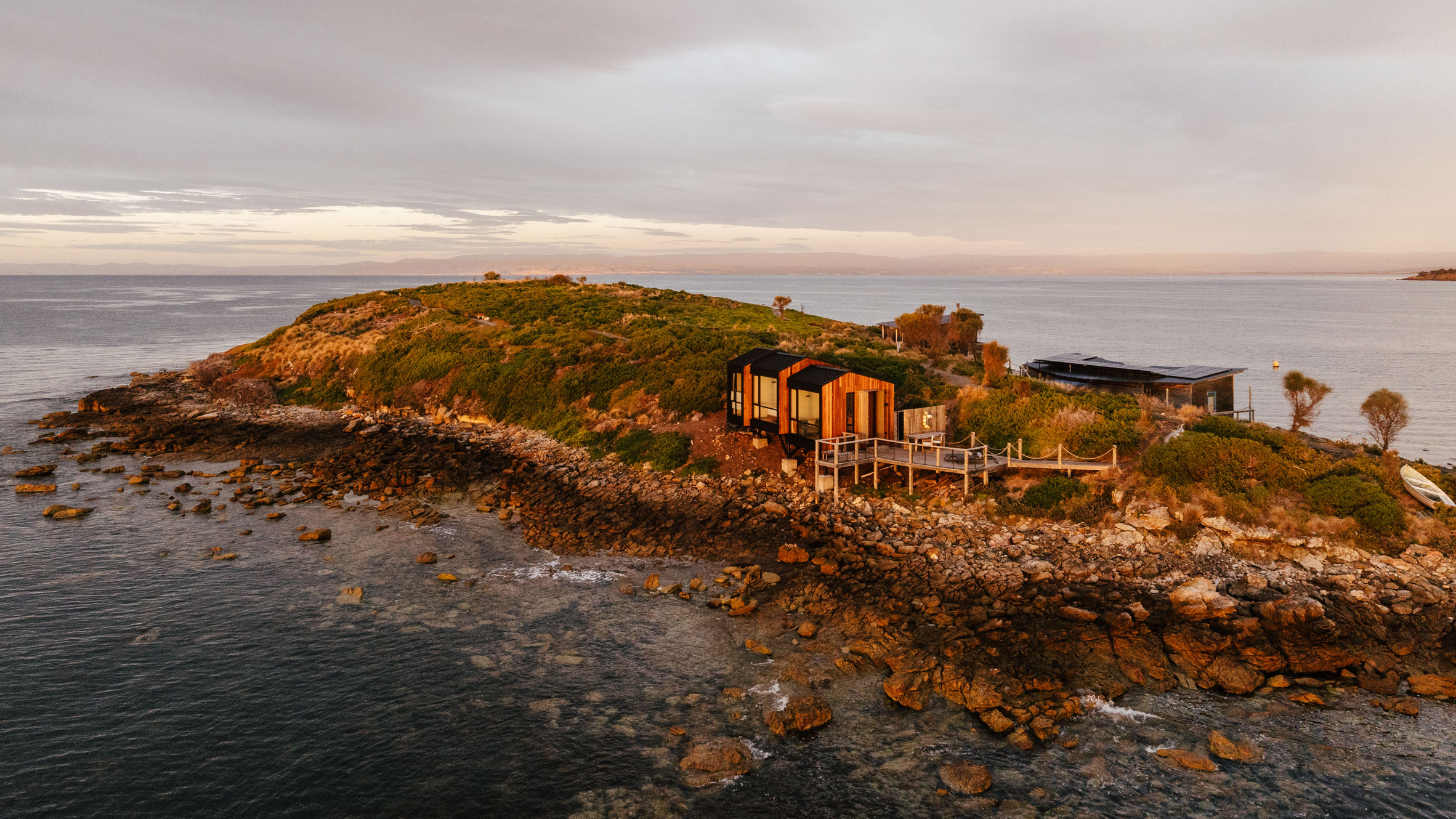 A cabana fica na Picnic Island, de propriedade privada, na Península Freycinet, na Tasmânia, que tem uma área de apenas um hectare e funciona tanto como um eco-resort fora da rede quanto como um santuário protegido para aves marinhas e pinguins.
