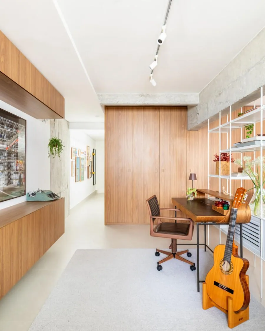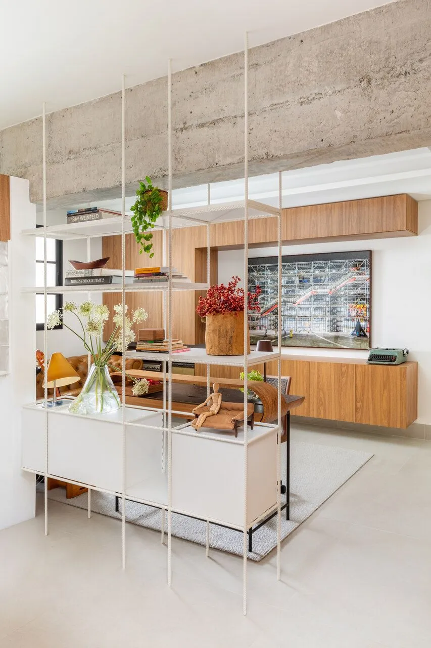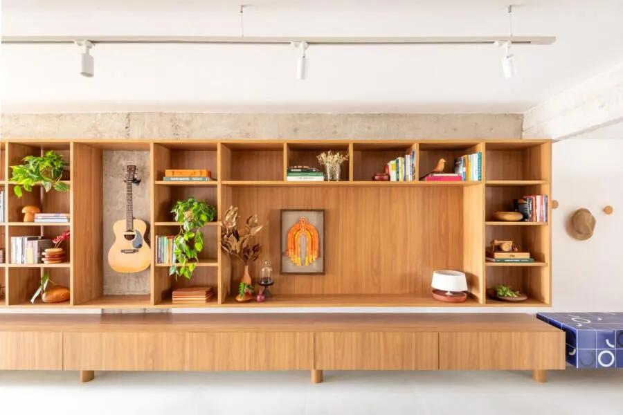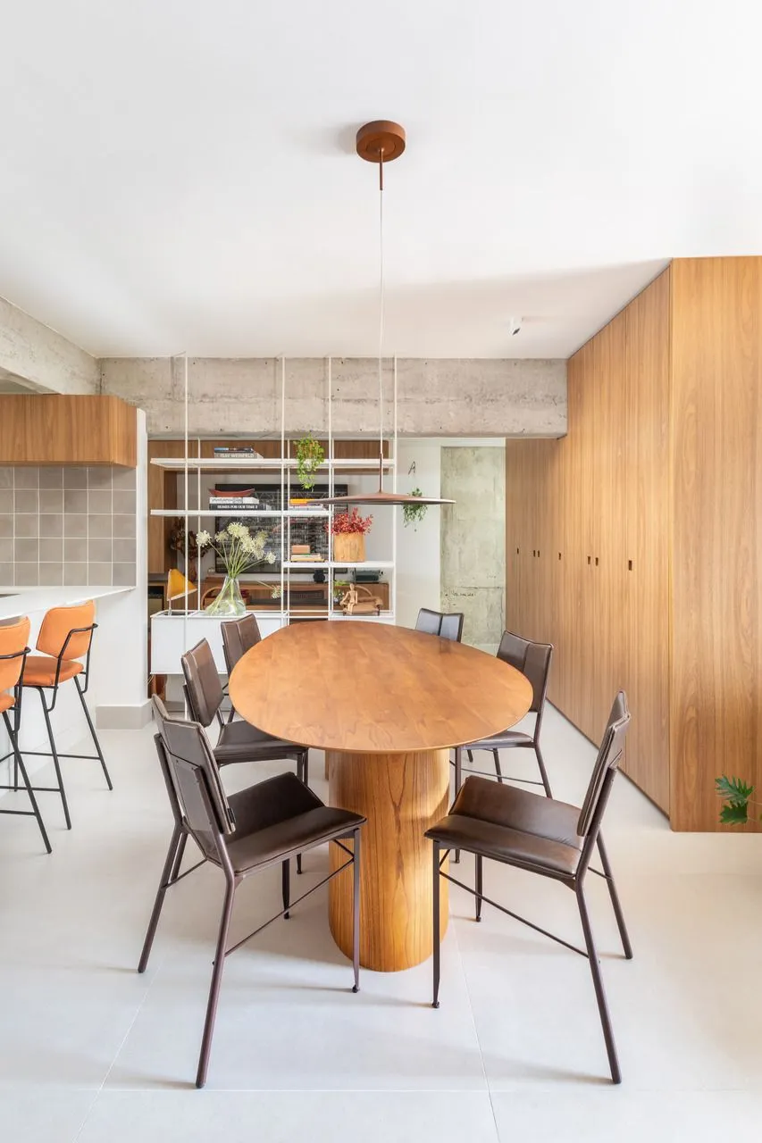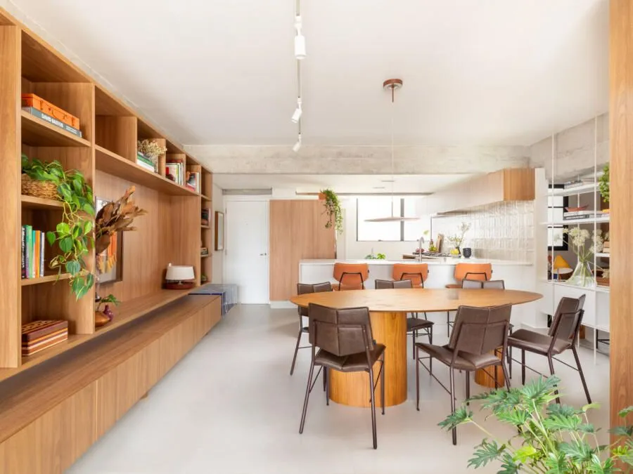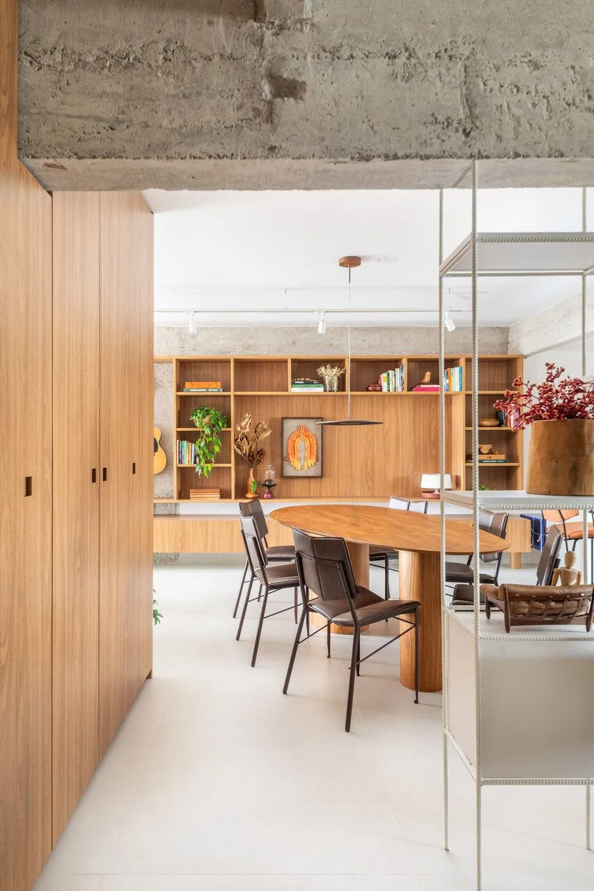 Durante a visita, a integração dos ambientes chama atenção logo de cara. Sala, jantar, cozinha e office funcionam como um único espaço. O concreto aparente é protagonista: vigas e pilares tiveram o reboco removido para deixar a estrutura à mostra, equilibrada por paredes brancas e muita madeira. Na sala, o destaque vai para a grande estante suspensa em freijó, com quase sete metros, que reúne livros, objetos afetivos e memórias do casal. O banco de concreto revestido em azulejaria, criado quase de última hora, acabou virando um dos detalhes mais queridos do projeto.