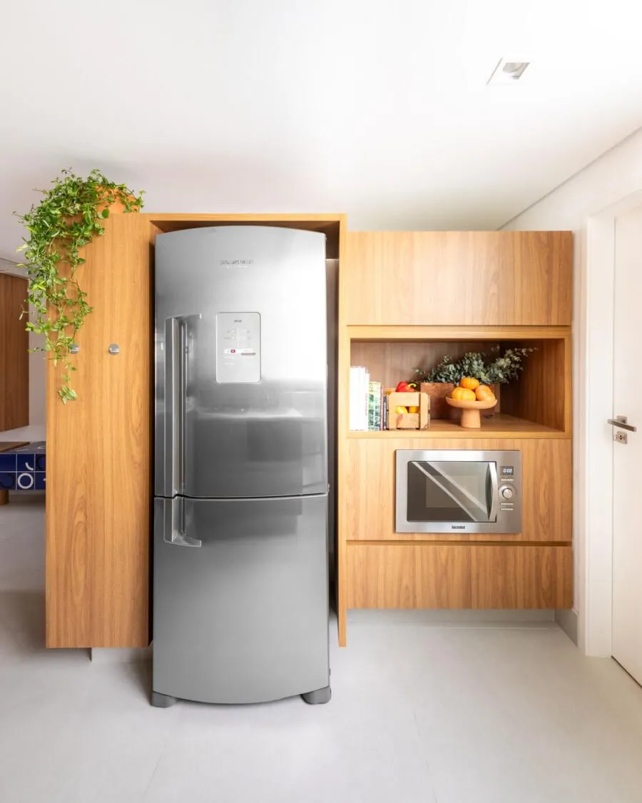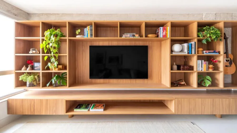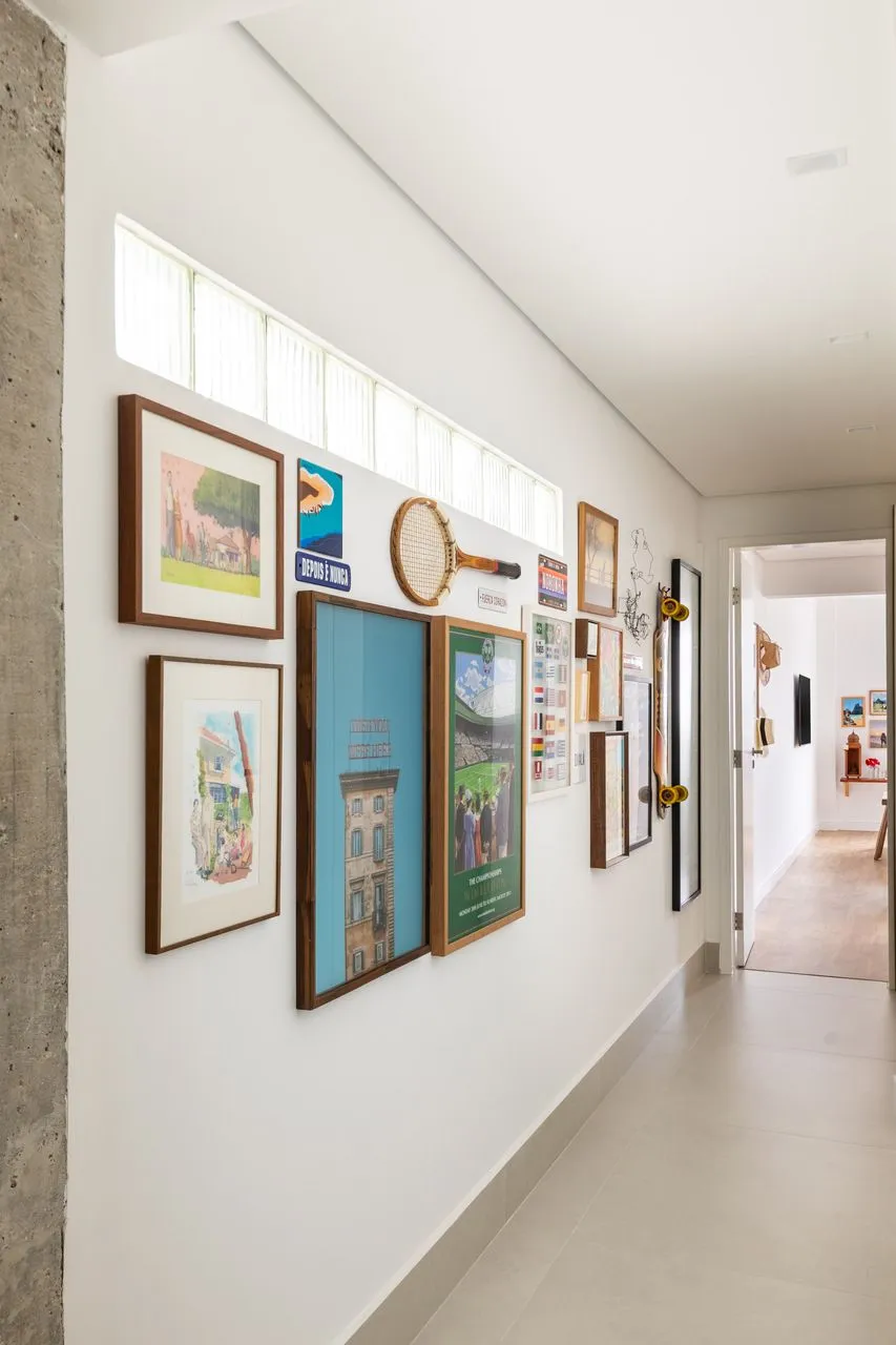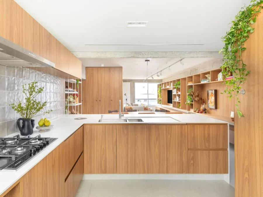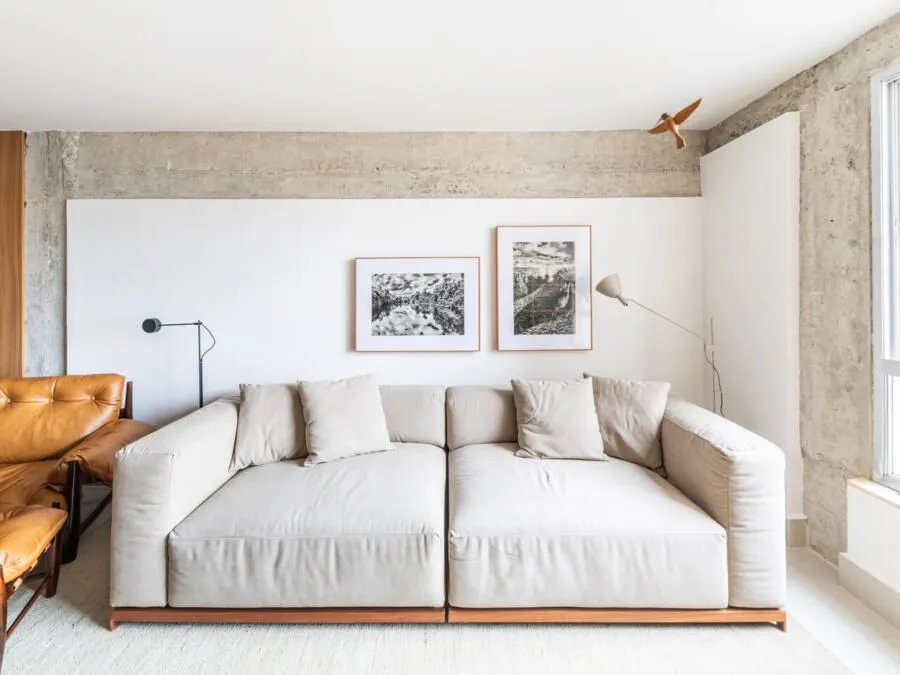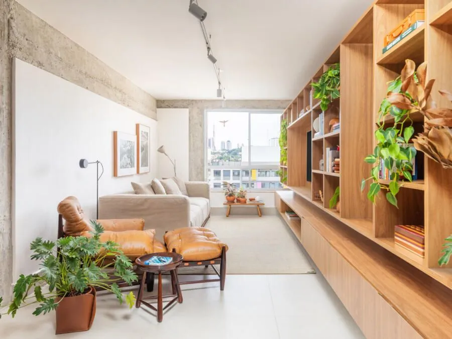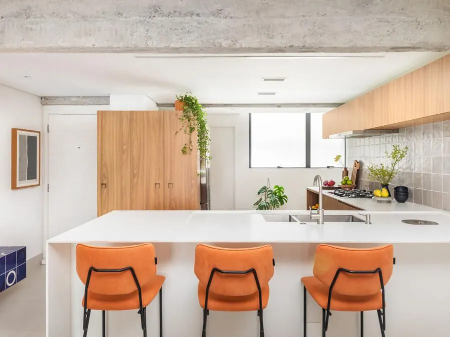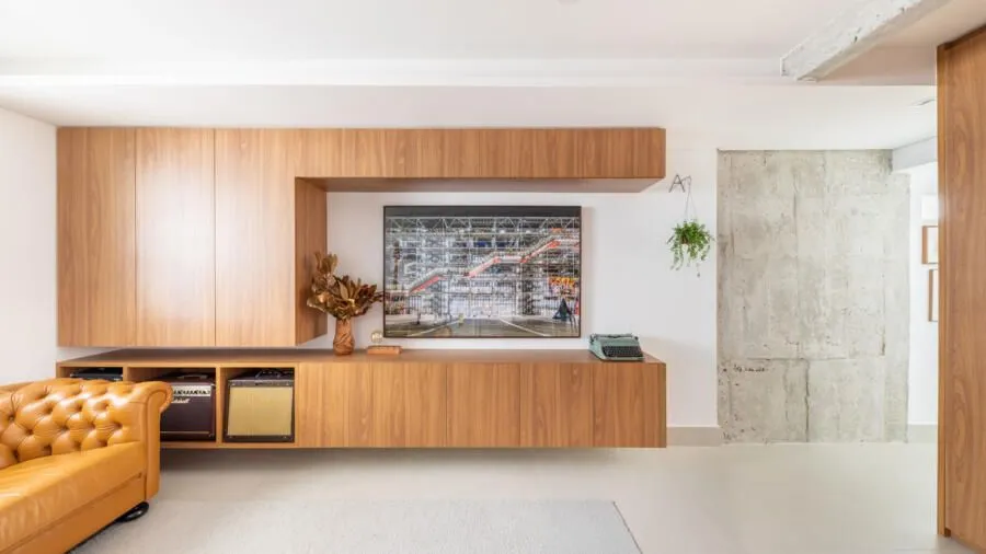 Durante a visita, a integração dos ambientes chama atenção logo de cara. Sala, jantar, cozinha e office funcionam como um único espaço. O concreto aparente é protagonista: vigas e pilares tiveram o reboco removido para deixar a estrutura à mostra, equilibrada por paredes brancas e muita madeira. Na sala, o destaque vai para a grande estante suspensa em freijó, com quase sete metros, que reúne livros, objetos afetivos e memórias do casal. O banco de concreto revestido em azulejaria, criado quase de última hora, acabou virando um dos detalhes mais queridos do projeto.