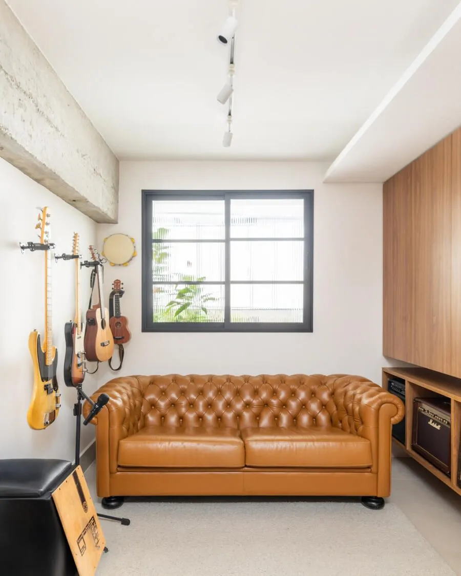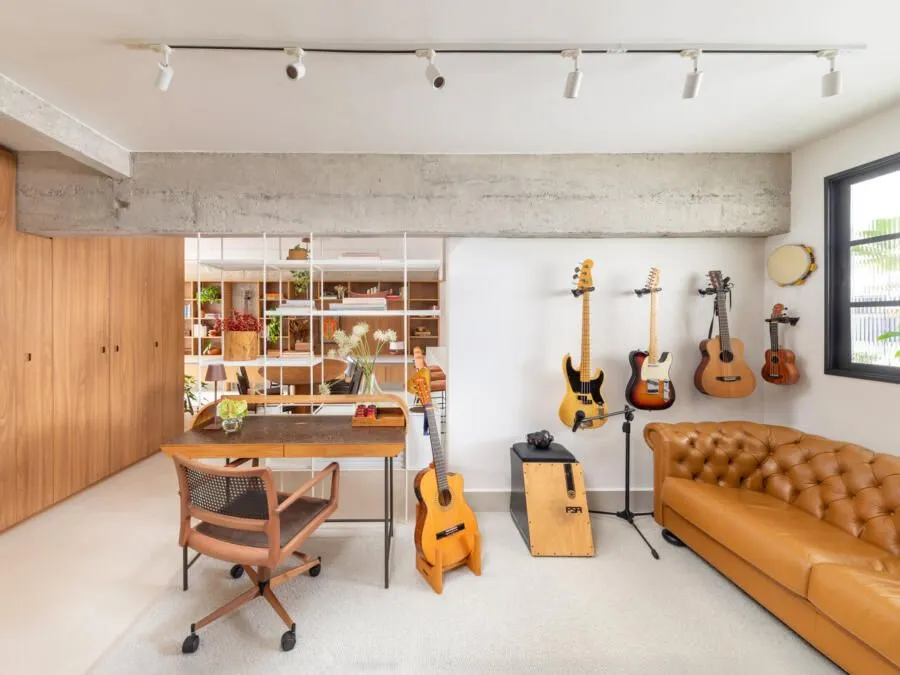 A cozinha é espaçosa e bem resolvida, com uma grande bancada em lâmina branca de Neolith que avança sobre a sala e se conecta à mesa de jantar. O janelão herdado da antiga lavanderia garante ótima iluminação natural. Já o espaço de trabalho e música é separado da sala por uma estante leve, feita de vergalhão e madeira, que delimita sem fechar. A marcenaria geométrica do escritório emoldura um grande retrato do Pompidou, presente de um amigo próximo.