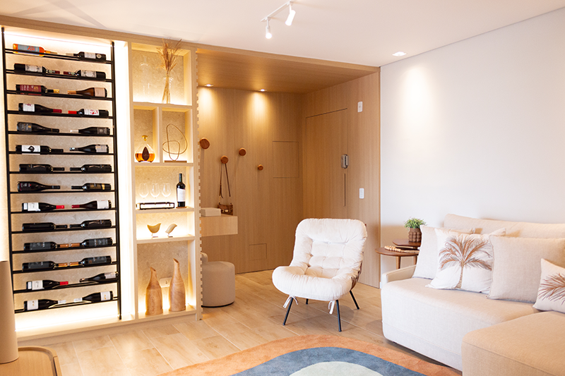 Encontrada pelo cliente através do Instagram, Carolina foi o primeiro contato da família com um profissional de arquitetura. Ao longo das conversas iniciais, o proprietário Marcos revelou o desejo de presentear seus pais com um apartamento “bem instagramável”, já que sua mãe adorava receber amigas e tinha grande apreço pela decoração. Além disso, o casal — viajantes assíduos — cultiva o hábito de trazer lembranças das viagens, especialmente garrafas de vinho, o que inspirou soluções afetivas e sofisticadas dentro do projeto. “Ao escutar com atenção cada detalhe da rotina e dos sonhos da família, desenvolvemos um projeto que aproveita ao máximo cada centímetro dos 77m², sempre equilibrando estética, funcionalidade e acolhimento”, conta a arquiteta Carolina Oliveira.