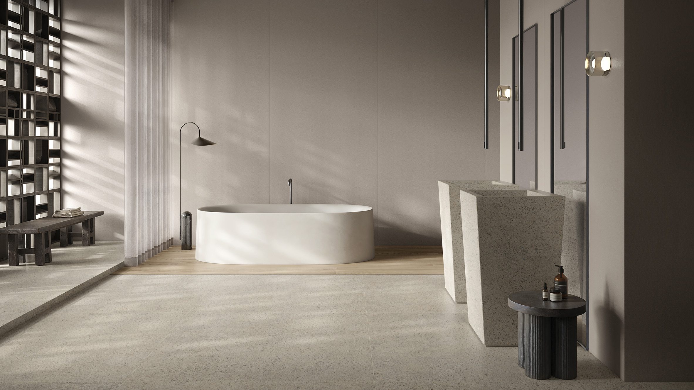 A coleção Elements Pebbles é adequada tanto para ambientes internos como externos em paredes e pisos, e Casalgrande Padana sugere usá-la para revestir elementos como interiores de guarda-roupas, bases de chuveiro ou móveis de lavatório.