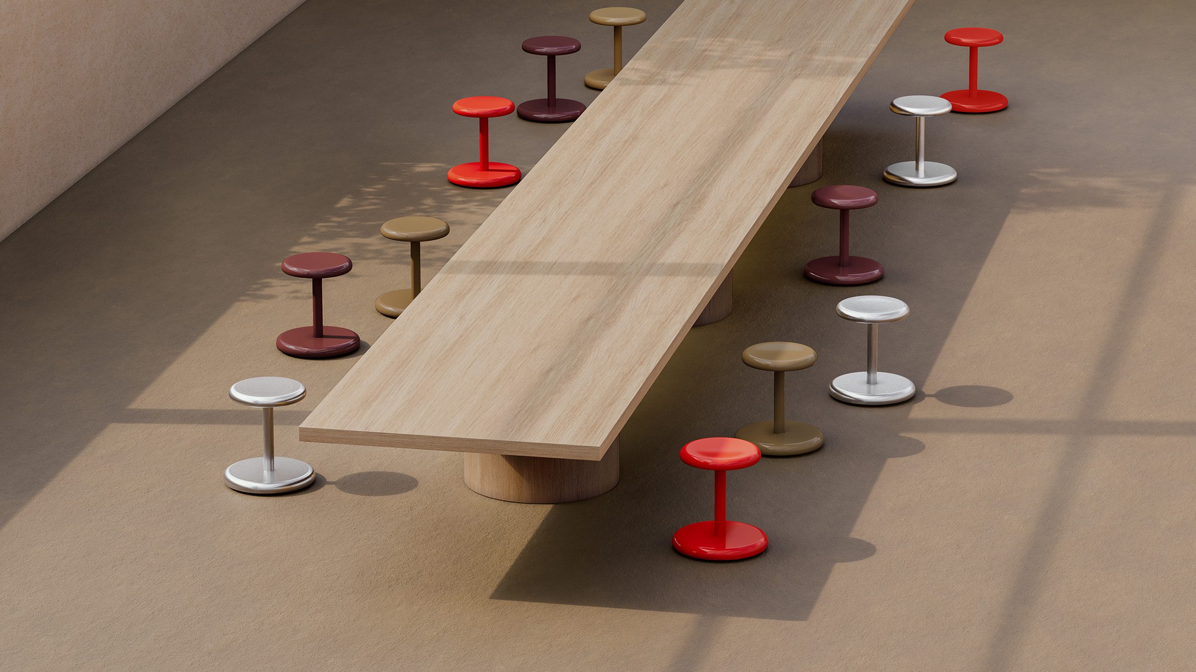 O banco Allround apropriadamente chamado vem em cores pop ou com acabamento em metal prateado, com a versão curta apresentando rodas ocultas integradas que o fazem deslizar pelo chão, e o banco alto possui um assento giratório.