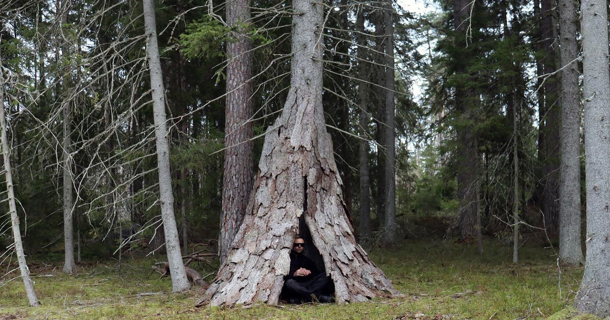 Construída em torno de um abeto vivo, a estrutura moldada por estúdio Ulf Mejergren Architects (UMA) usa o tronco como pilar central. Uma estrutura leve de vigas de madeira revestidas com placas de masonita forma um esqueleto secundário, permitindo que a casca seja estratificada e fixada com um grampeador e uma chave de fenda. Devido à sua qualidade fina, quase semelhante a papel, a casca do abeto se comporta mais como uma pele do que como uma superfície rígida, dobrando-se, sobrepondo-se e adaptando-se à forma. Em contraste com a casca mais espessa do pinheiro, cria um envelope mais macio e permeável. A cabana assume a forma de uma tenda, encerrando um pequeno espaço interior que pode ser acessado através de uma abertura estreita. No interior funciona como um simples abrigo, um local para sentar e observar a floresta envolvente, quase como se estivesse dentro da própria árvore, por baixo da sua casca exterior. A estrutura está parcialmente camuflada entre as árvores, mas a sua forma destaca-se como uma presença distinta e ligeiramente estranha.