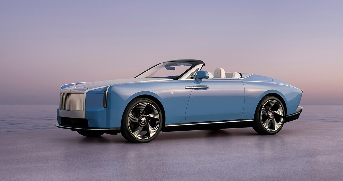De perfil, o conceito Project Nightingale da Rolls-Royce parece um volume esculpido e monolítico sobre um conjunto de peças. A cabine fica baixa e a carroceria sobe atrás dos assentos para criar aquela sensação de fechamento sem adicionar uma estrutura separada. Ele mantém o carro aberto legível como uma só peça.