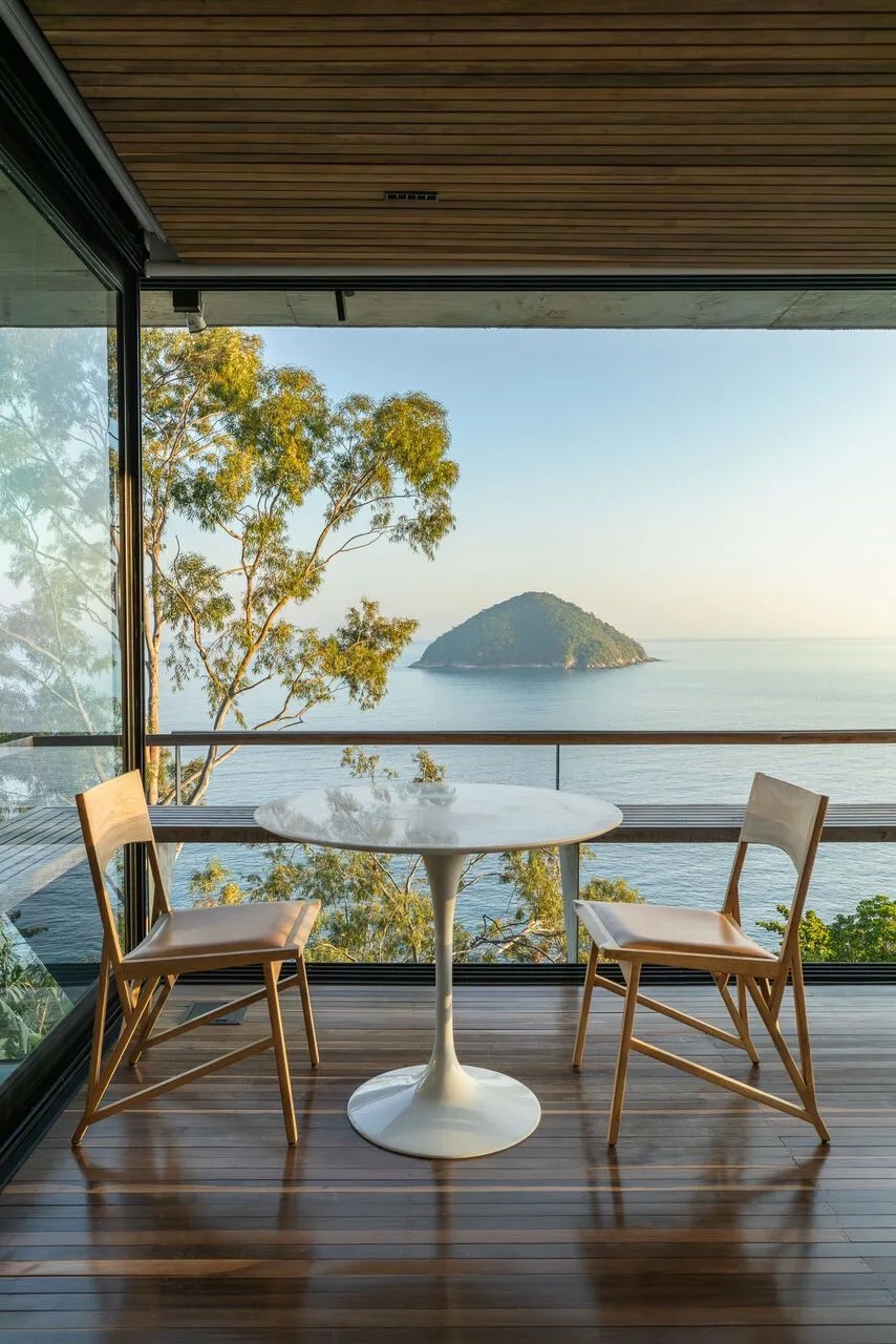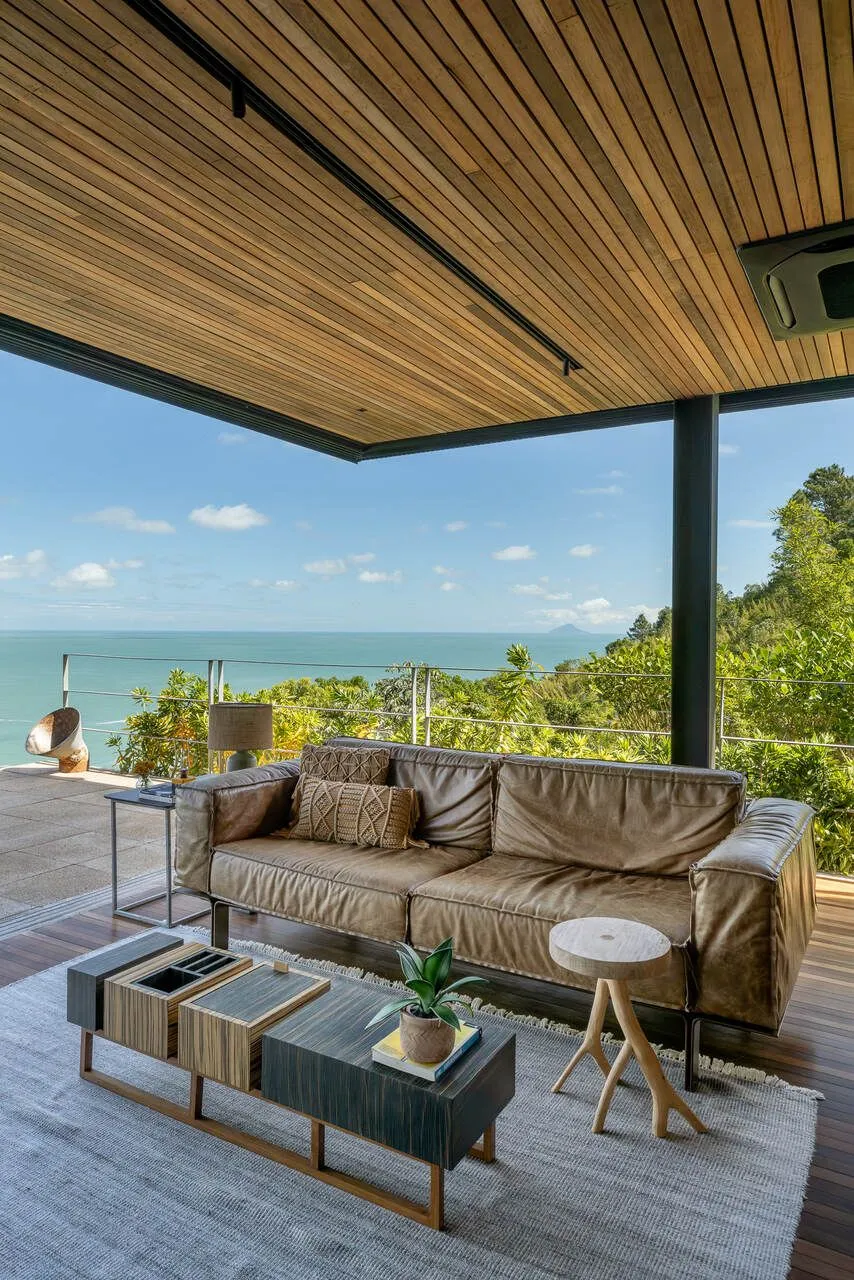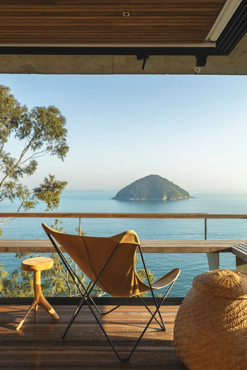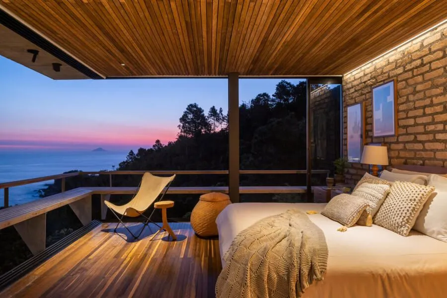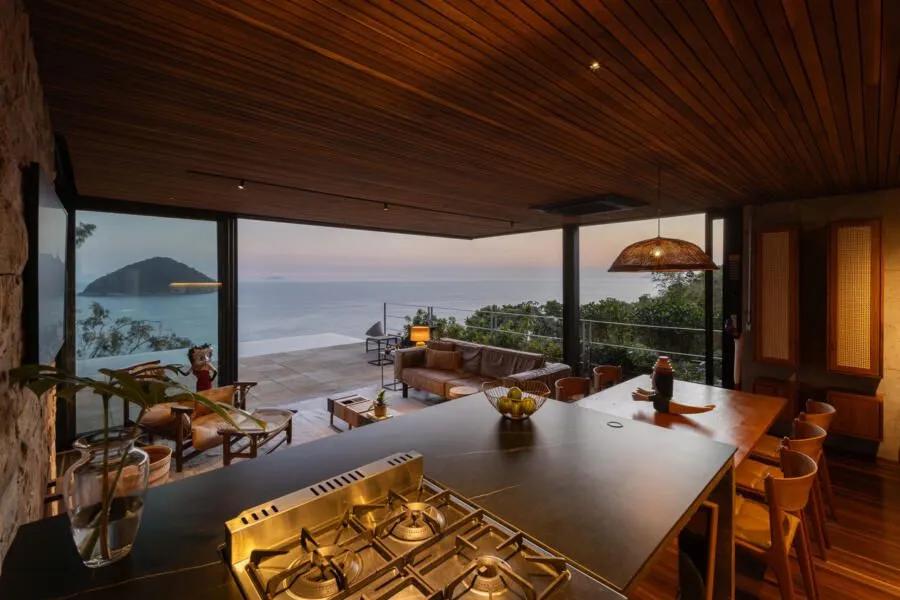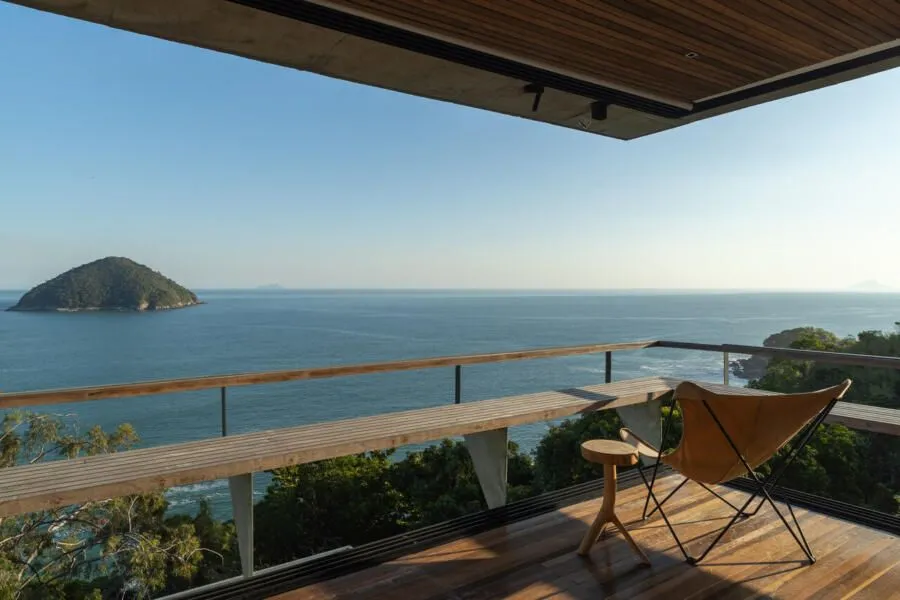 E essa casa tem uma característica que a torna ainda mais especial. Construída em um terreno estreito, com apenas 10 metros de largura, ela funciona quase como uma “casa-barco”, navegando entre a serra do mar e o oceano. A vista é absolutamente cinematográfica e acompanha a gente o tempo todo, como se o horizonte fosse parte da arquitetura. É aquele tipo de lugar que faz o peito abrir assim que a gente entra.