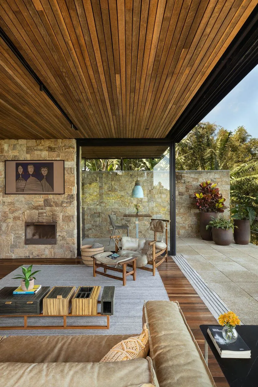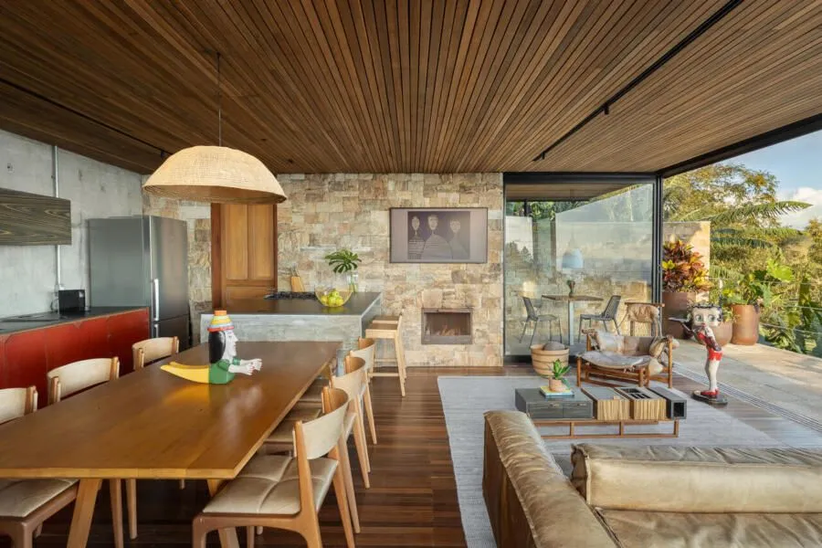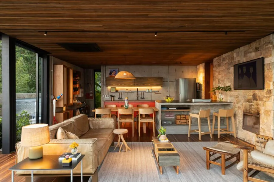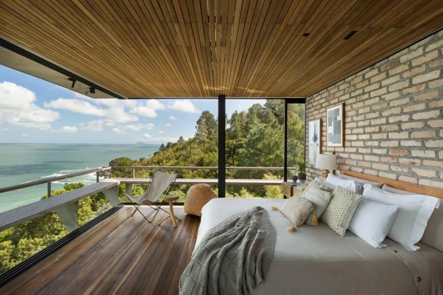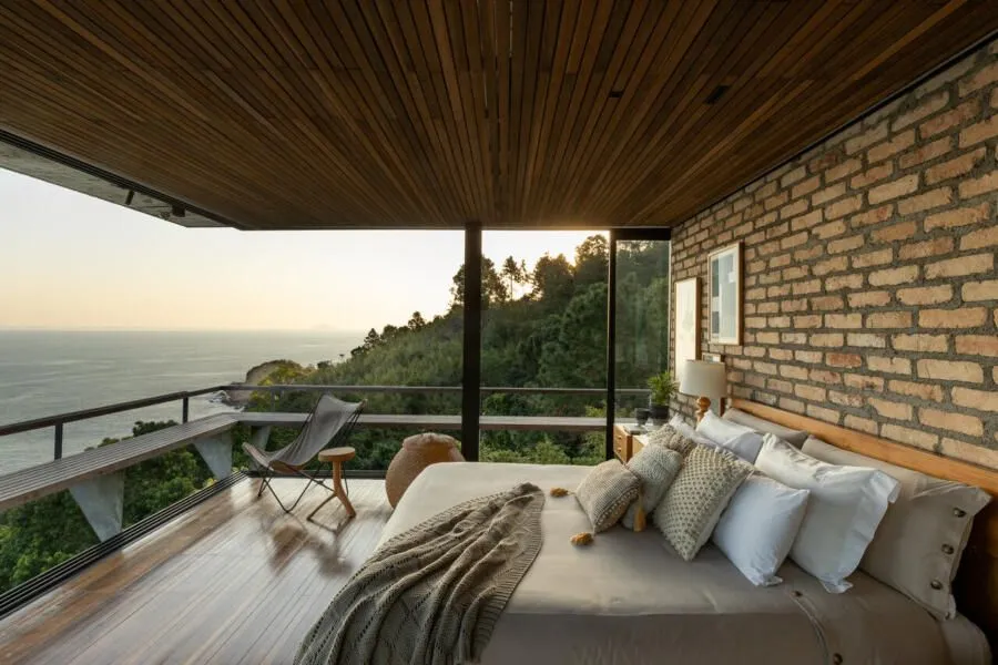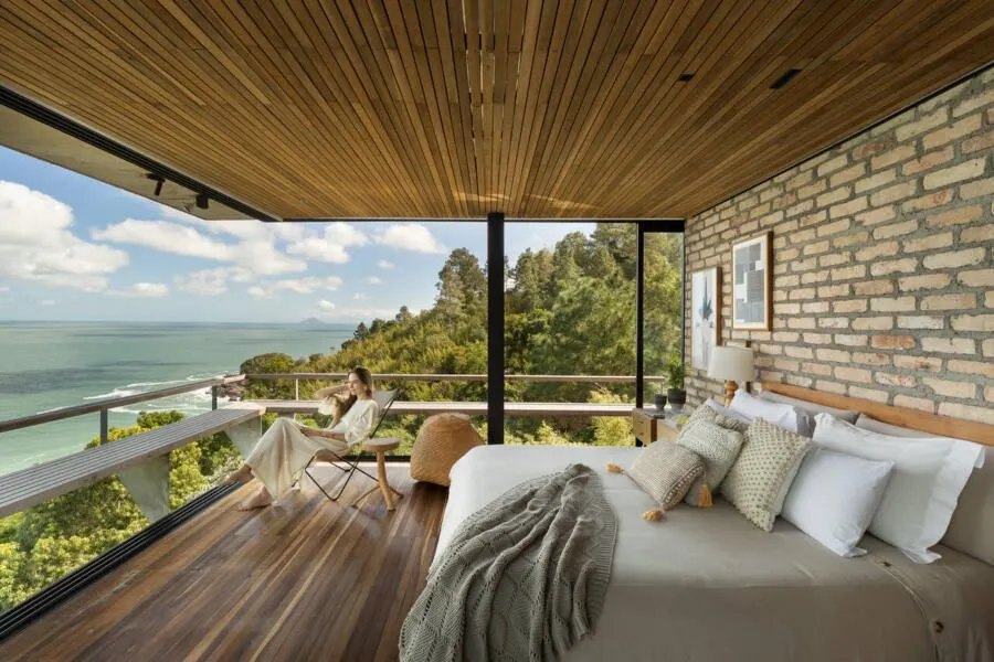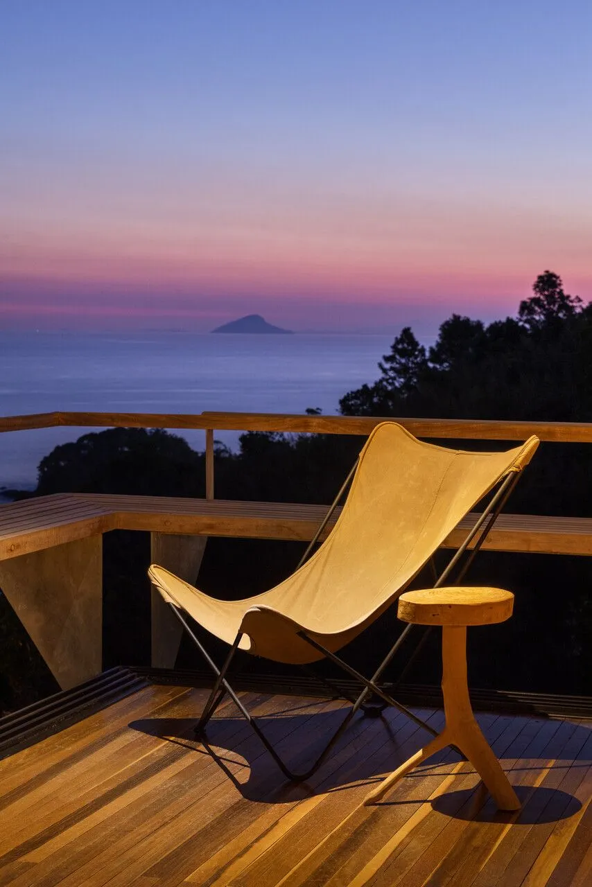 E essa casa tem uma característica que a torna ainda mais especial. Construída em um terreno estreito, com apenas 10 metros de largura, ela funciona quase como uma “casa-barco”, navegando entre a serra do mar e o oceano. A vista é absolutamente cinematográfica e acompanha a gente o tempo todo, como se o horizonte fosse parte da arquitetura. É aquele tipo de lugar que faz o peito abrir assim que a gente entra.