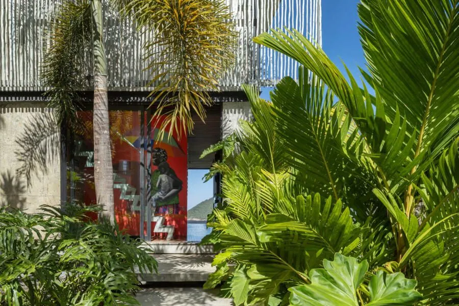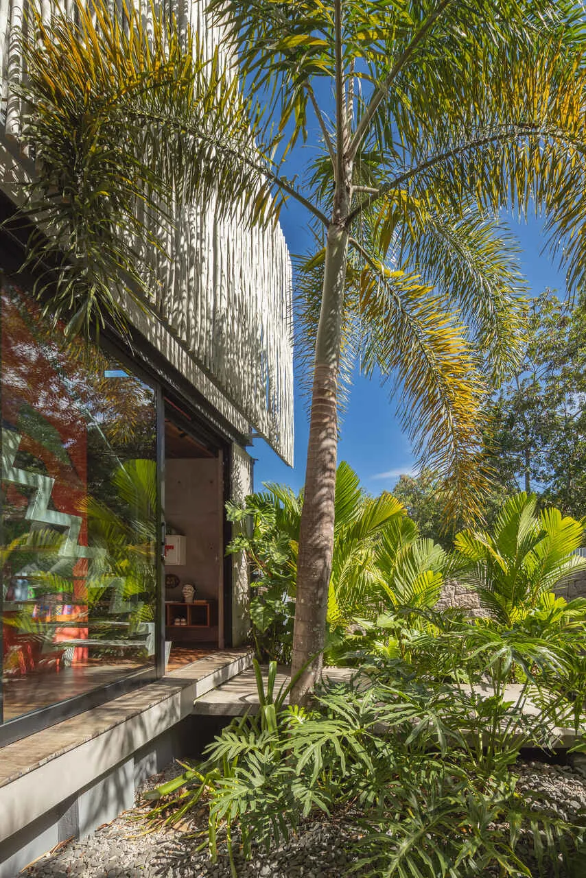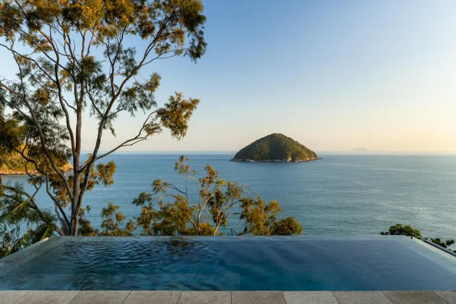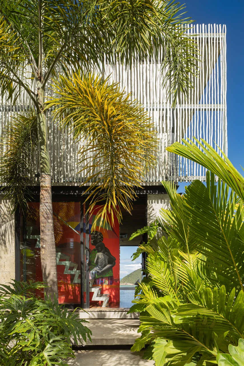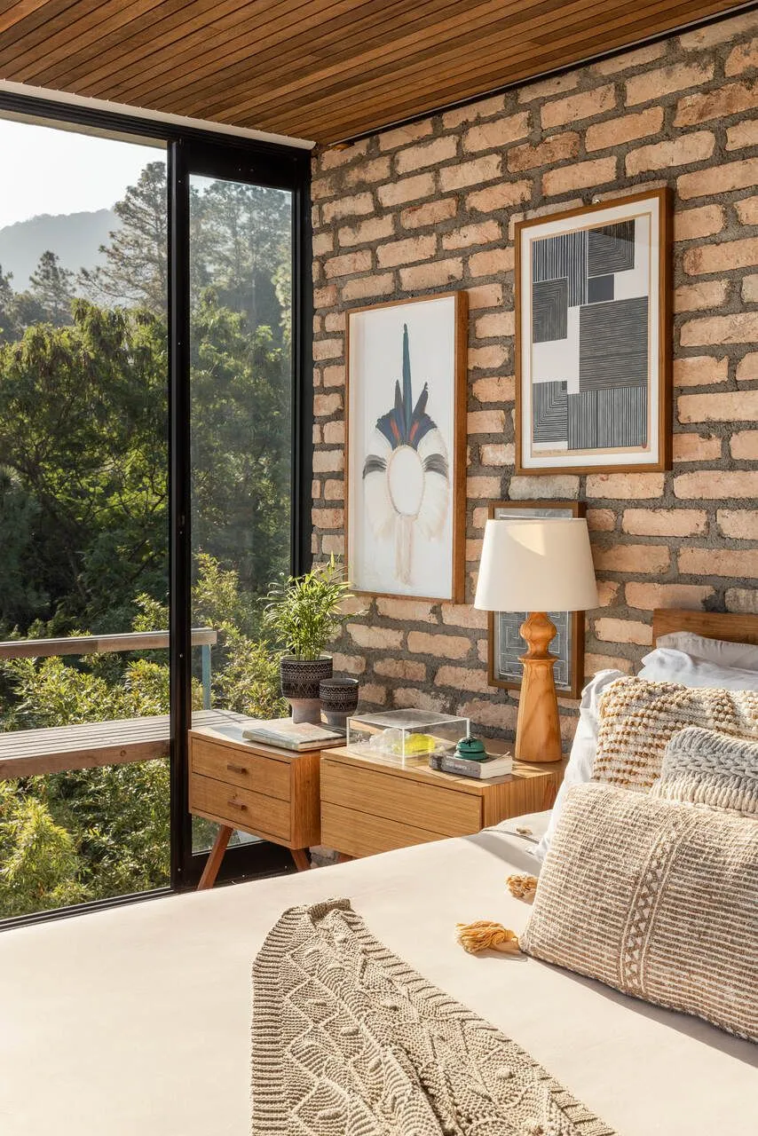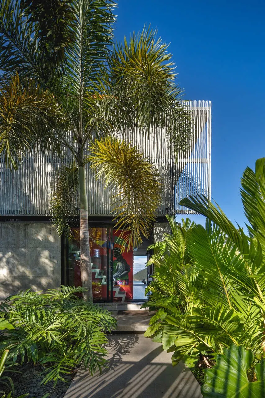 E essa casa tem uma característica que a torna ainda mais especial. Construída em um terreno estreito, com apenas 10 metros de largura, ela funciona quase como uma “casa-barco”, navegando entre a serra do mar e o oceano. A vista é absolutamente cinematográfica e acompanha a gente o tempo todo, como se o horizonte fosse parte da arquitetura. É aquele tipo de lugar que faz o peito abrir assim que a gente entra.