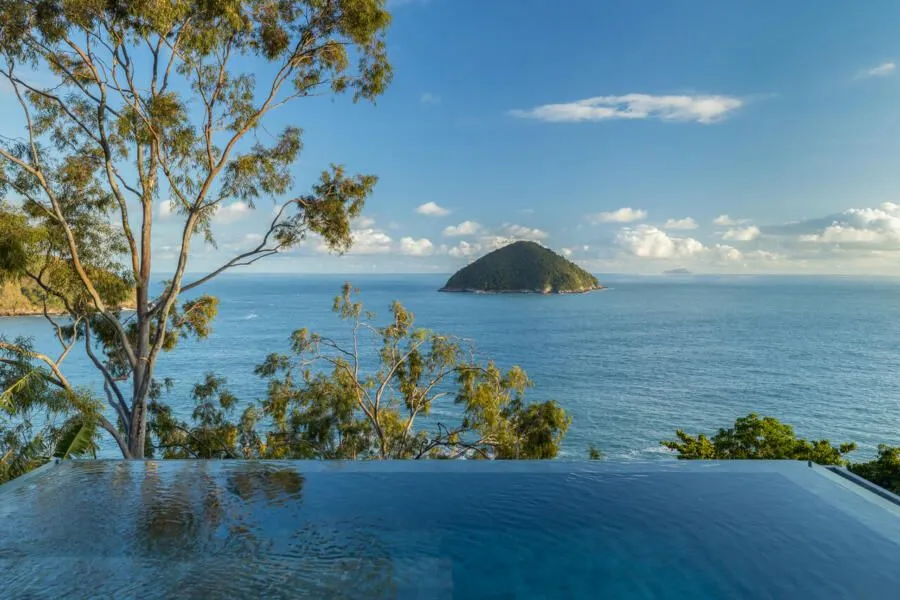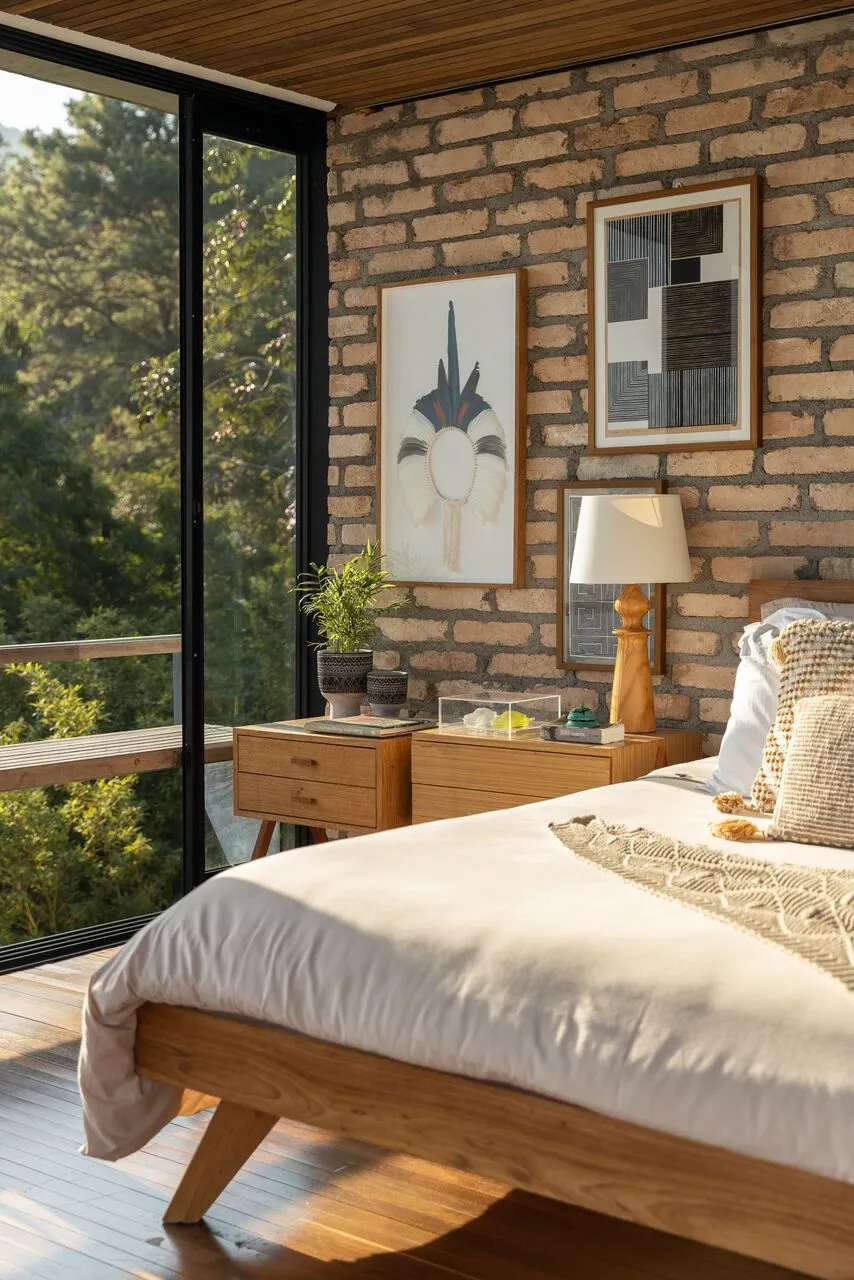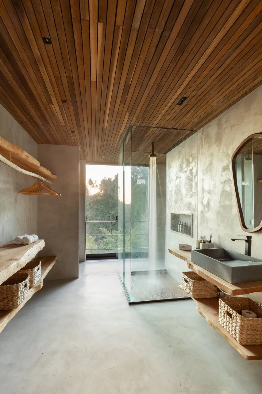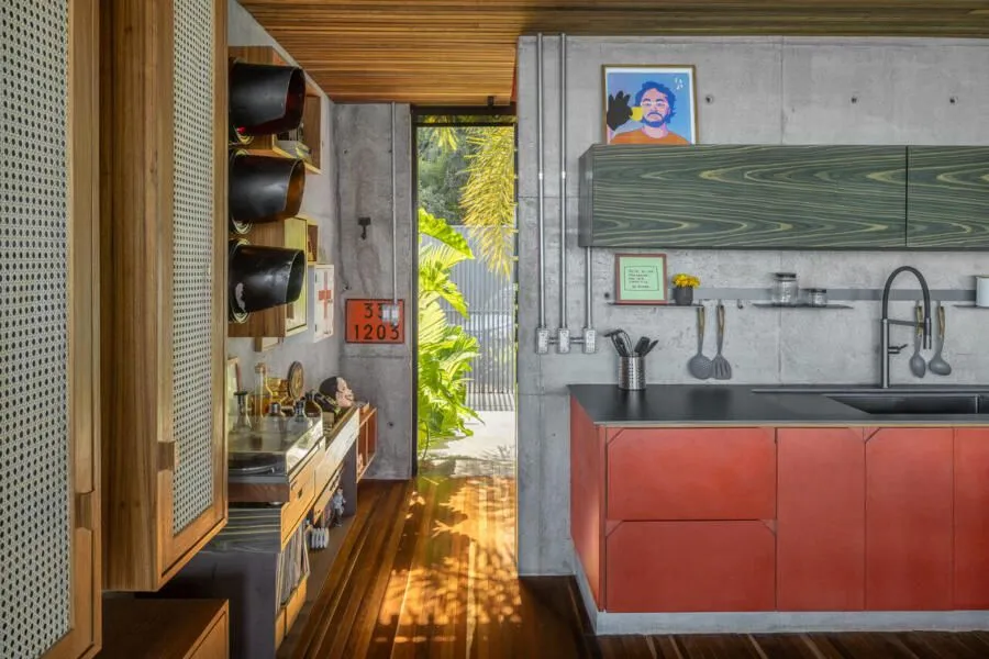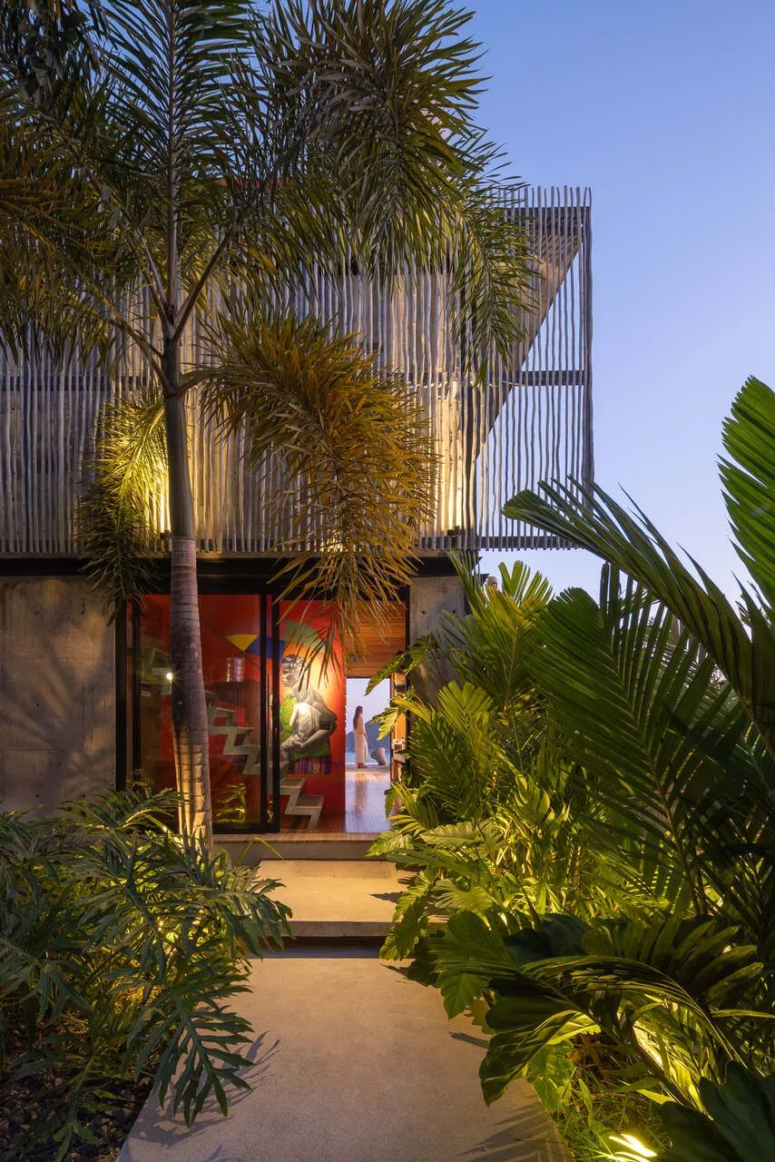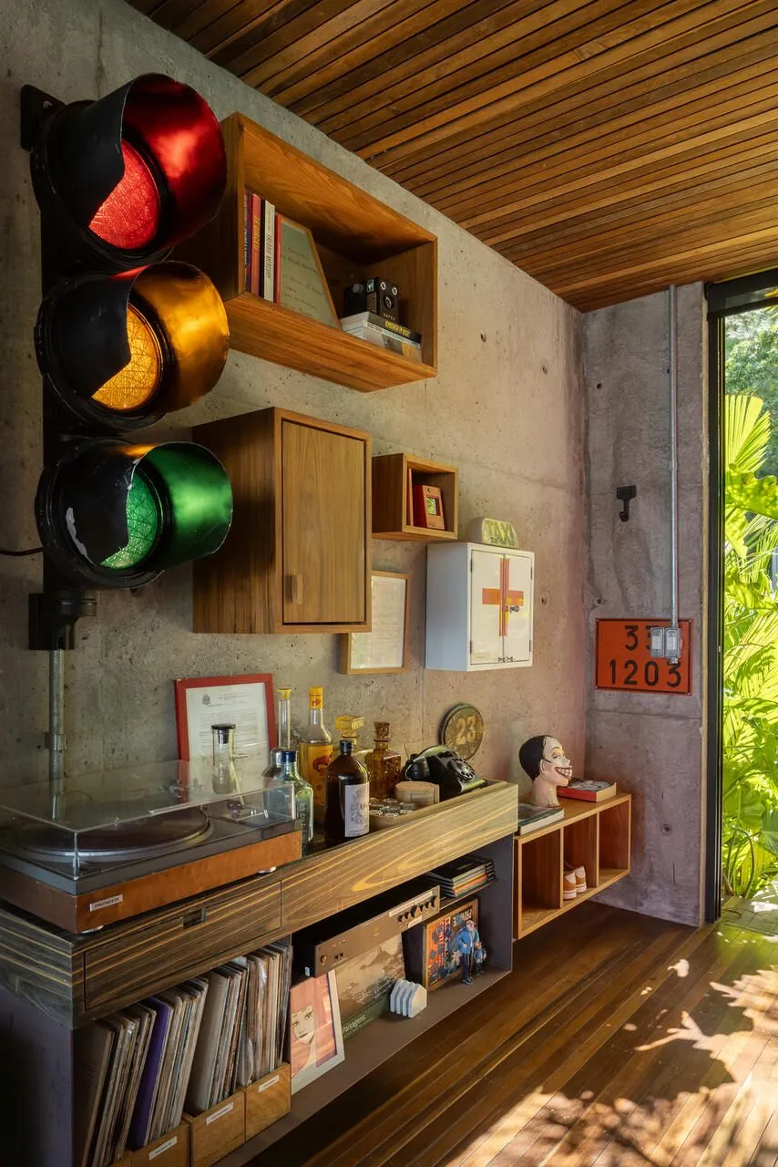 E essa casa tem uma característica que a torna ainda mais especial. Construída em um terreno estreito, com apenas 10 metros de largura, ela funciona quase como uma “casa-barco”, navegando entre a serra do mar e o oceano. A vista é absolutamente cinematográfica e acompanha a gente o tempo todo, como se o horizonte fosse parte da arquitetura. É aquele tipo de lugar que faz o peito abrir assim que a gente entra.