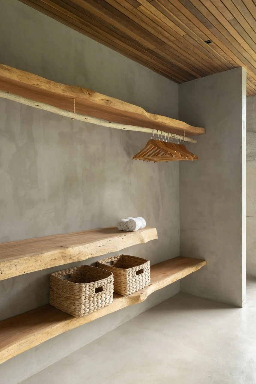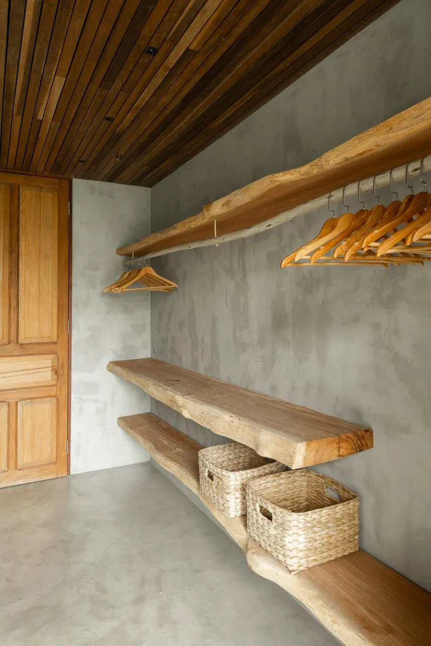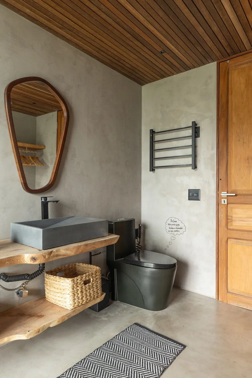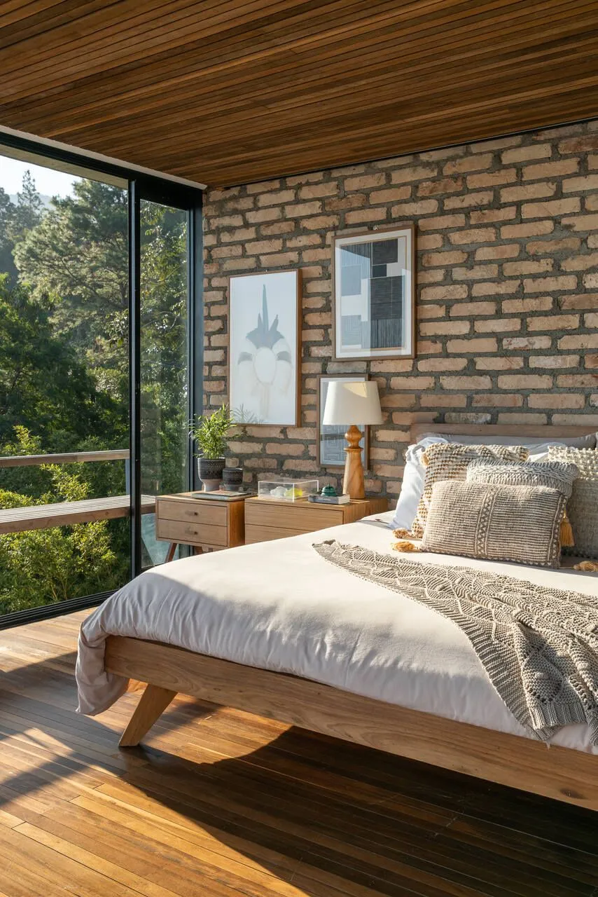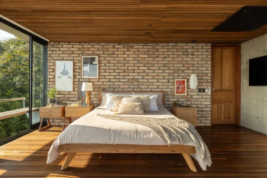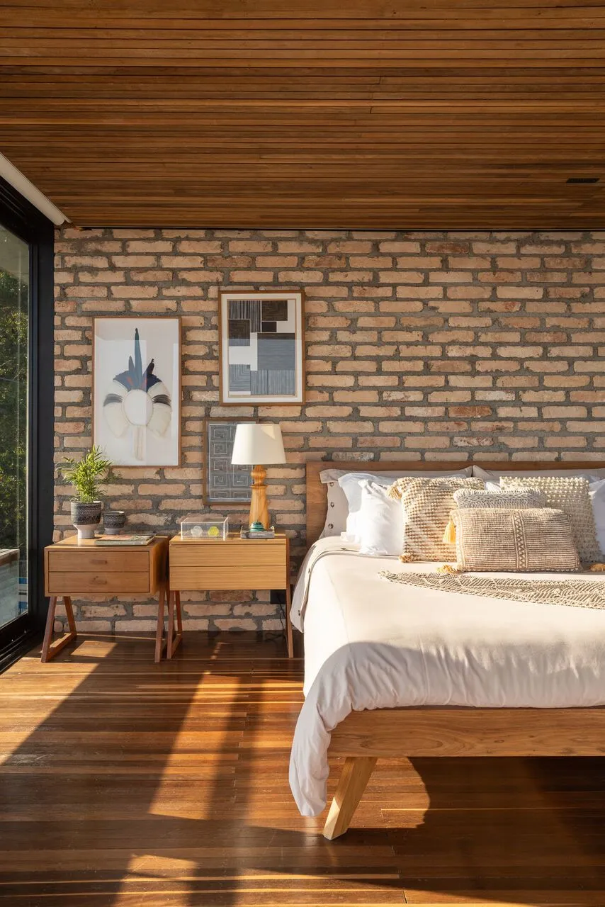 Essa fala dos arquitetos traduz exatamente o que eu senti caminhando pela casa. O projeto aposta em uma arquitetura contemporânea, de linhas retas e grandes vãos, combinada a materiais naturais como pedra, madeira, aço e concreto aparente. No pavimento térreo, tudo se conecta: sala de estar, cozinha integrada, lavabo, churrasqueira, deck e piscina dialogam entre si e com a paisagem. Nada é fechado, nada interrompe o olhar — a casa está completamente aberta para o pôr do sol e para a vista de Toque Toque Grande.