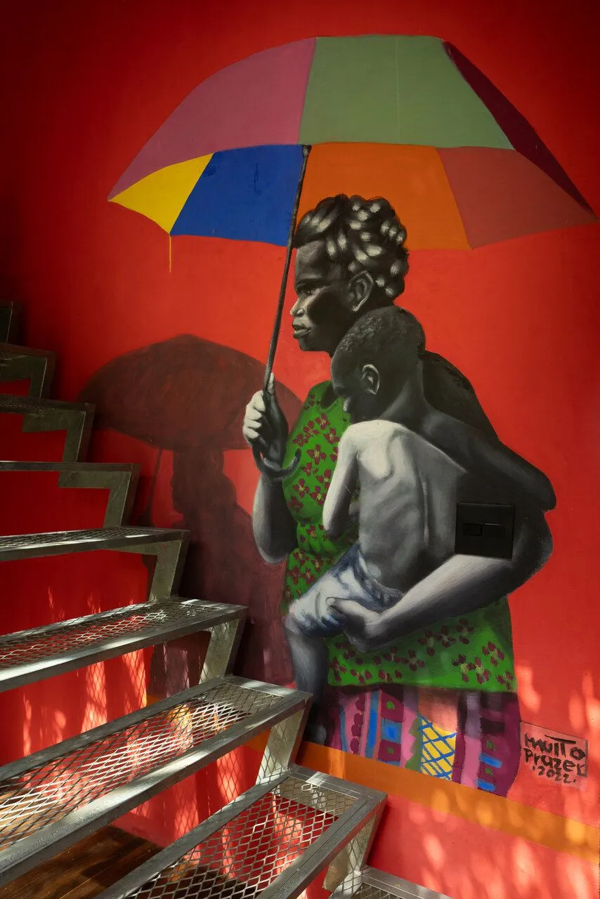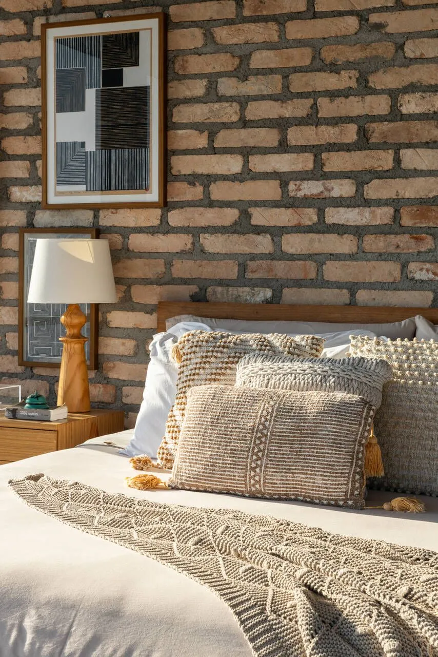Na sala, a TV Samsung The Frame aparece quase como mais uma obra do projeto, e não como um elemento tecnológico que rouba a cena. Instalada na parede, logo acima da lareira, ela se integra com tanta naturalidade que realmente parece um quadro. Com menos de 3 cm de espessura, tela matte livre de reflexos e o One Connect, que resolve tudo com um único fio totalmente discreto, nada interfere na leitura do espaço. O mais bonito é ver a tecnologia servindo à criação: ali, o Carlito exibe as próprias obras na tela, trocando as imagens como quem muda a curadoria de uma galeria particular.