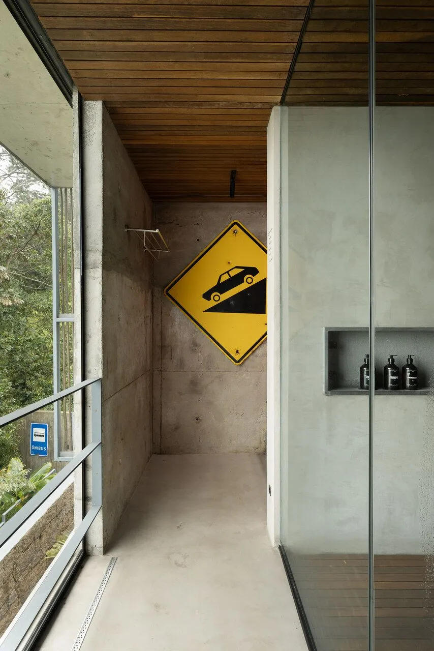 Quem vê a casa pronta hoje mal imagina os desafios enfrentados ao longo do processo. O terreno em declive acentuado, os acessos difíceis, as contenções e drenagens necessárias e, principalmente, a piscina suspensa a nove metros de altura, apoiada em grandes pilotis. Tudo em concreto aparente, o que exigiu um trabalho extremamente preciso de formas e travamentos. Ver isso de perto, com os arquitetos explicando cada decisão, muda completamente a forma como a gente enxerga o resultado final.