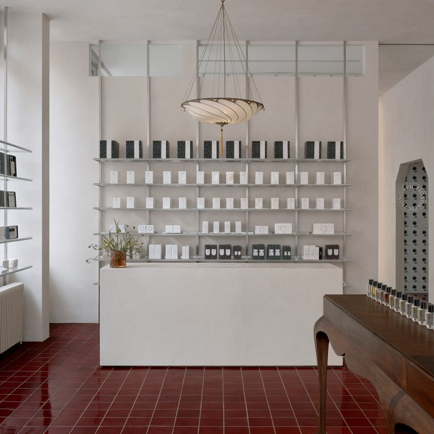 Paredes caiadas e prateleiras de metal minimalistas contrastam com os azulejos sangue de boi dentro de uma perfumaria