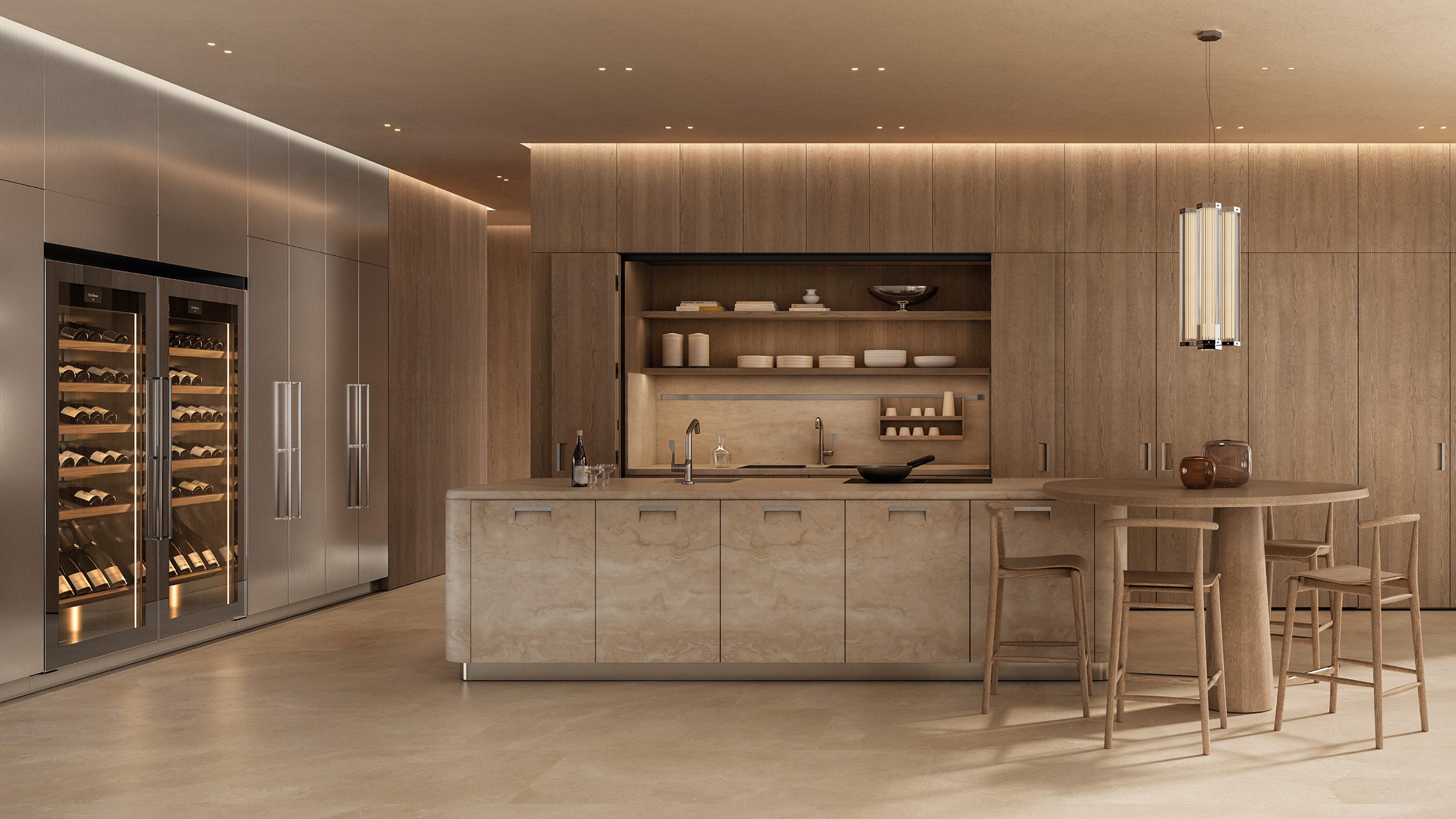 Curvas fluidas, presença escultural e materialidade monolítica se encontram em Koraque pretende constituir o coração da cozinha, integrando a preparação, a cozedura e o armazenamento dos alimentos.