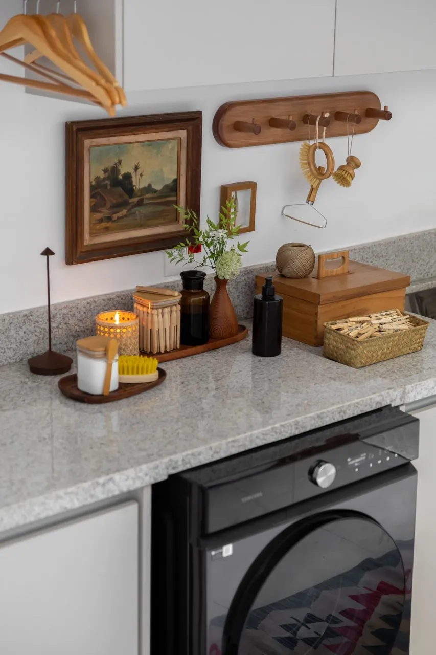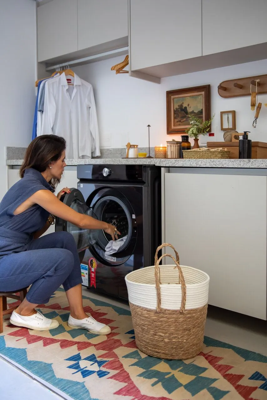 A música, que sempre faz parte da nossa rotina, fica por conta da Samsung Music Frame, que se conecta em segundos e reproduz a trilha perfeita para cada momento: da terapia do café da manhã ao jantar com amigos. Com uma aparência discreta e que se assemelha a um porta-retratos, ela ainda fica linda em qualquer ambiente, parecendo fazer parte da composição. Já a TV The Frame transforma a sala em uma galeria particular, alternando entre obras de arte e a programação do dia, sempre com aquele visual minimalista e elegante que se integra ao décor. E, nos bastidores, a lava e seca trabalha enquanto tudo acontece: com ciclos inteligentes, notificações sobre o andamento de cada etapa e com a garantia de que as peças saiam prontas para uso — tudo isso acompanhado pelo SmartThings, que integra cada aparelho em um único toque.