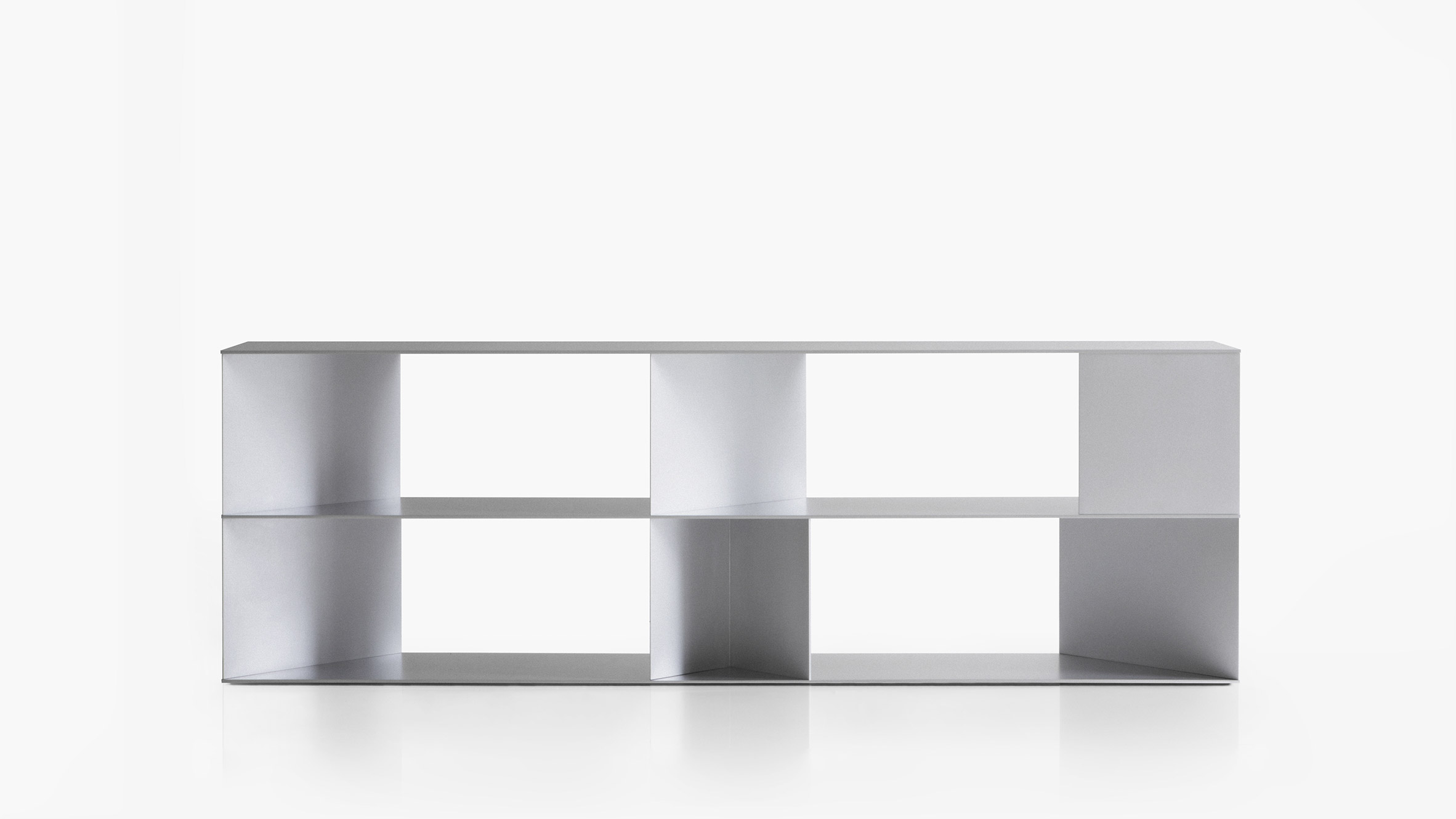 O Estante Ryo é uma estante aberta e multifuncional feita inteiramente de finas folhas de alumínio, moldadas em suportes triangulares ajustáveis na borda e no meio que refletem a luz e criam áreas de sombra.