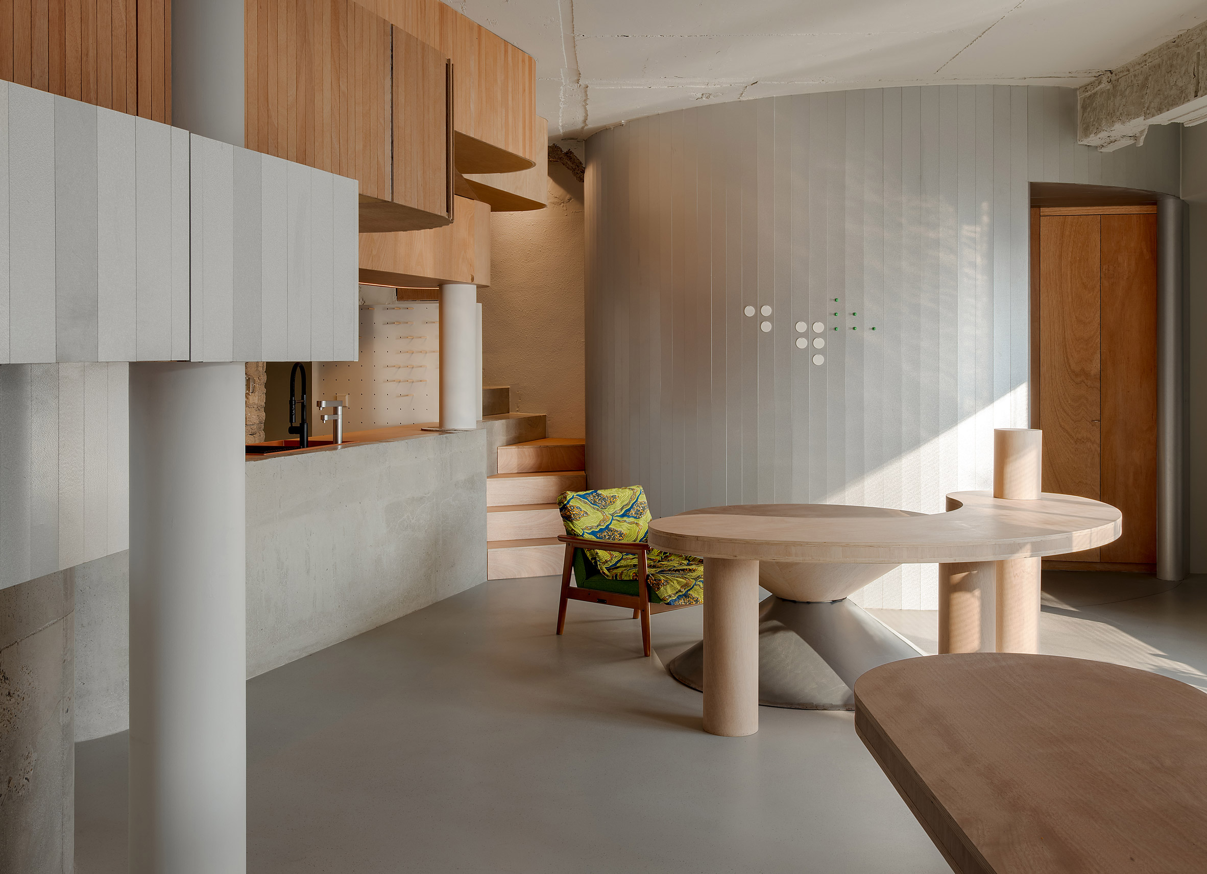 As funções do edifício estão organizadas em três níveis, sendo que a entrada conduz diretamente a um espaço social no rés-do-chão. Aqui, uma barra de concreto e madeira compensada é ladeada por uma área de armazenamento curvada revestida de aço e um banheiro de azulejos.