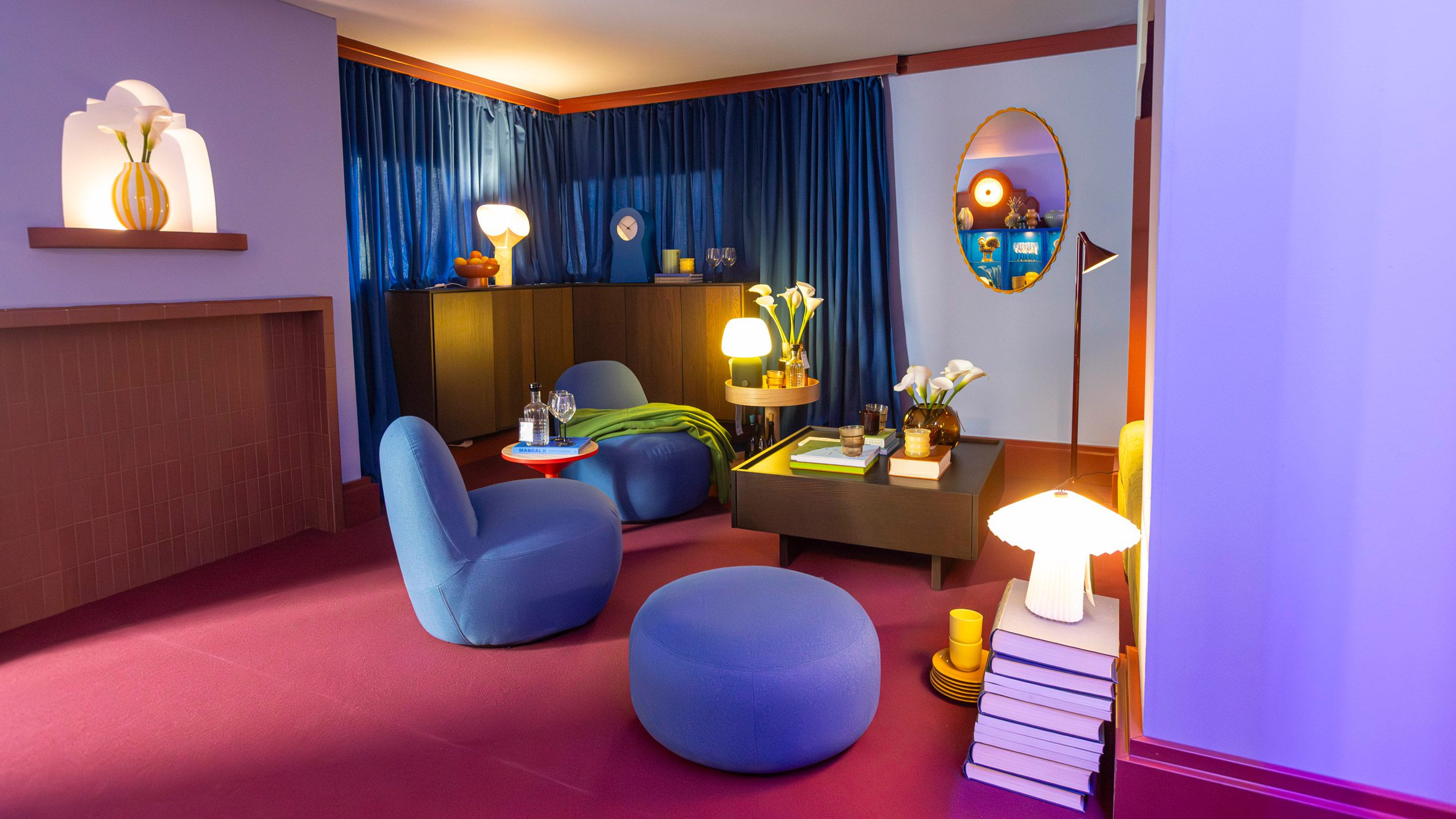 Uma sala de estar com assentos azuis, piso vermelho e iluminação aconchegante apresentada na exposição Food for Thought da IKEA em Milão