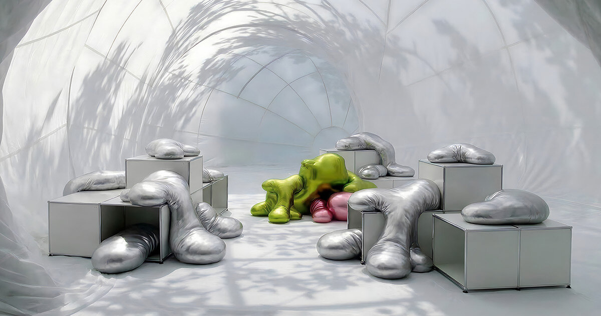 No interior, a atmosfera muda completamente. A superfície têxtil difunde a luz do dia em um brilho suave e uniforme, enquanto as sombras das árvores circundantes são registradas como padrões lentos e em movimento nas paredes curvas. Os elementos do piso e dos assentos são dispostos em blocos modulares, ecoando a grade externa, mas suavizados pelo ambiente. Formas infladas com acabamentos metálicos repousam sobre essas superfícies, seu peso sugerido pela gravidade e pelo contato, e não pela massa.