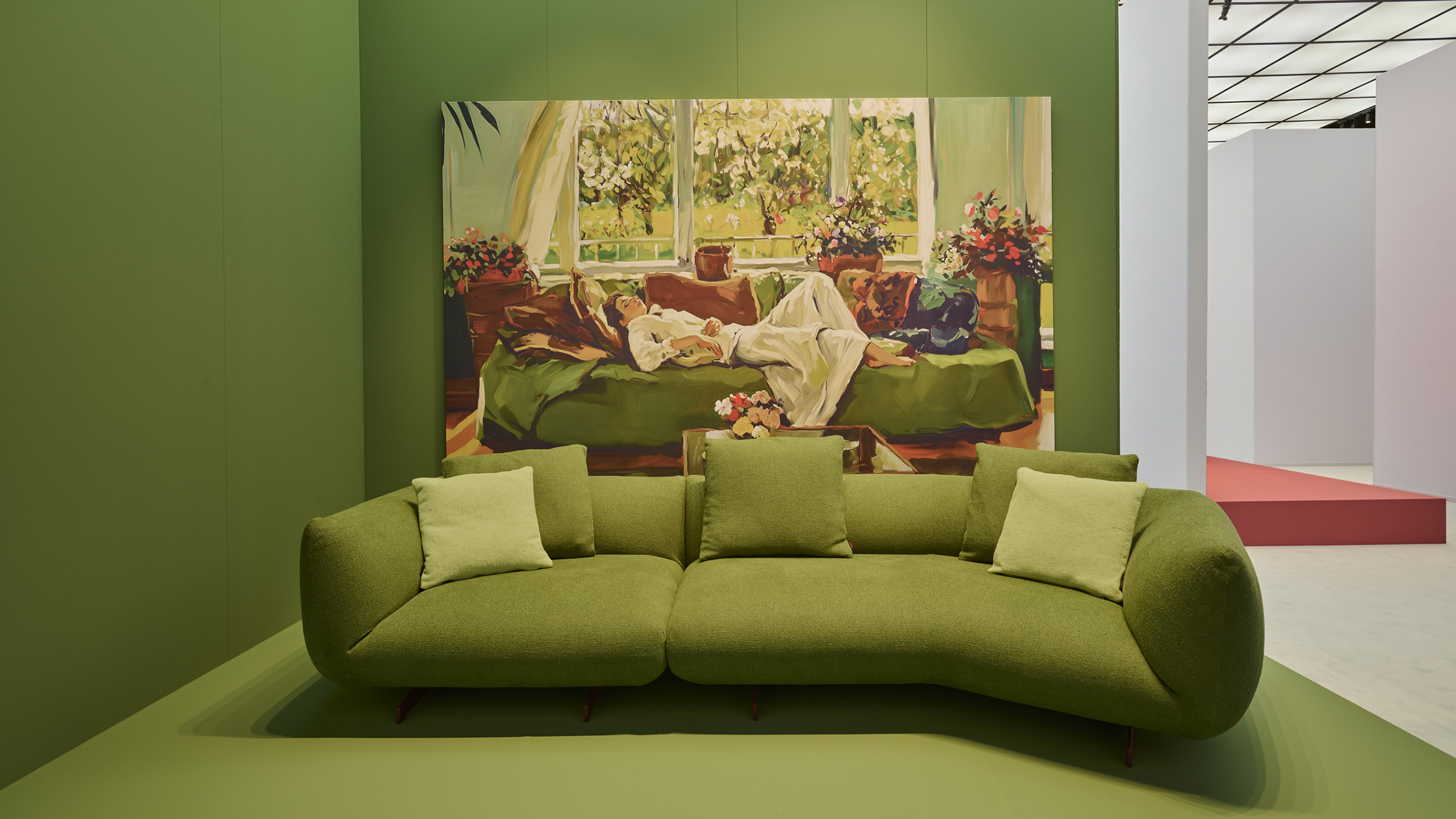 Foto da cadeira Savoia de Barber Osgerby e Kartell em frente a um fundo verde-maçã com uma pintura de uma cena de jardim em seu estande do Salone del Mobile 2026