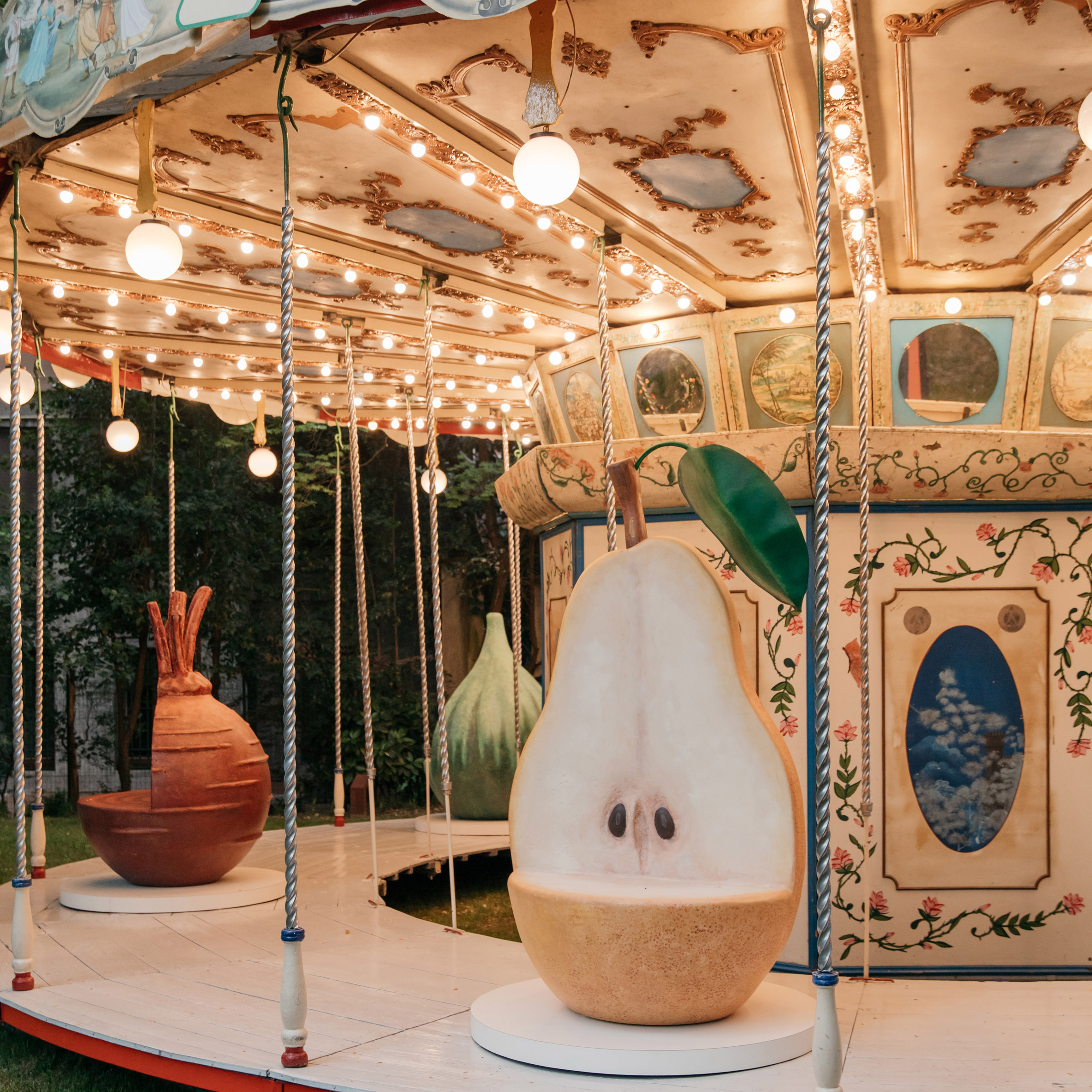 A estilista Laila Gohar transformou um carrossel tradicional, trocando suas figuras originais por frutas e vegetais grandes em comemoração à sua primeira coleção de pronto-a-vestir, lançada na semana de design de Milão com a marca de moda Arket.