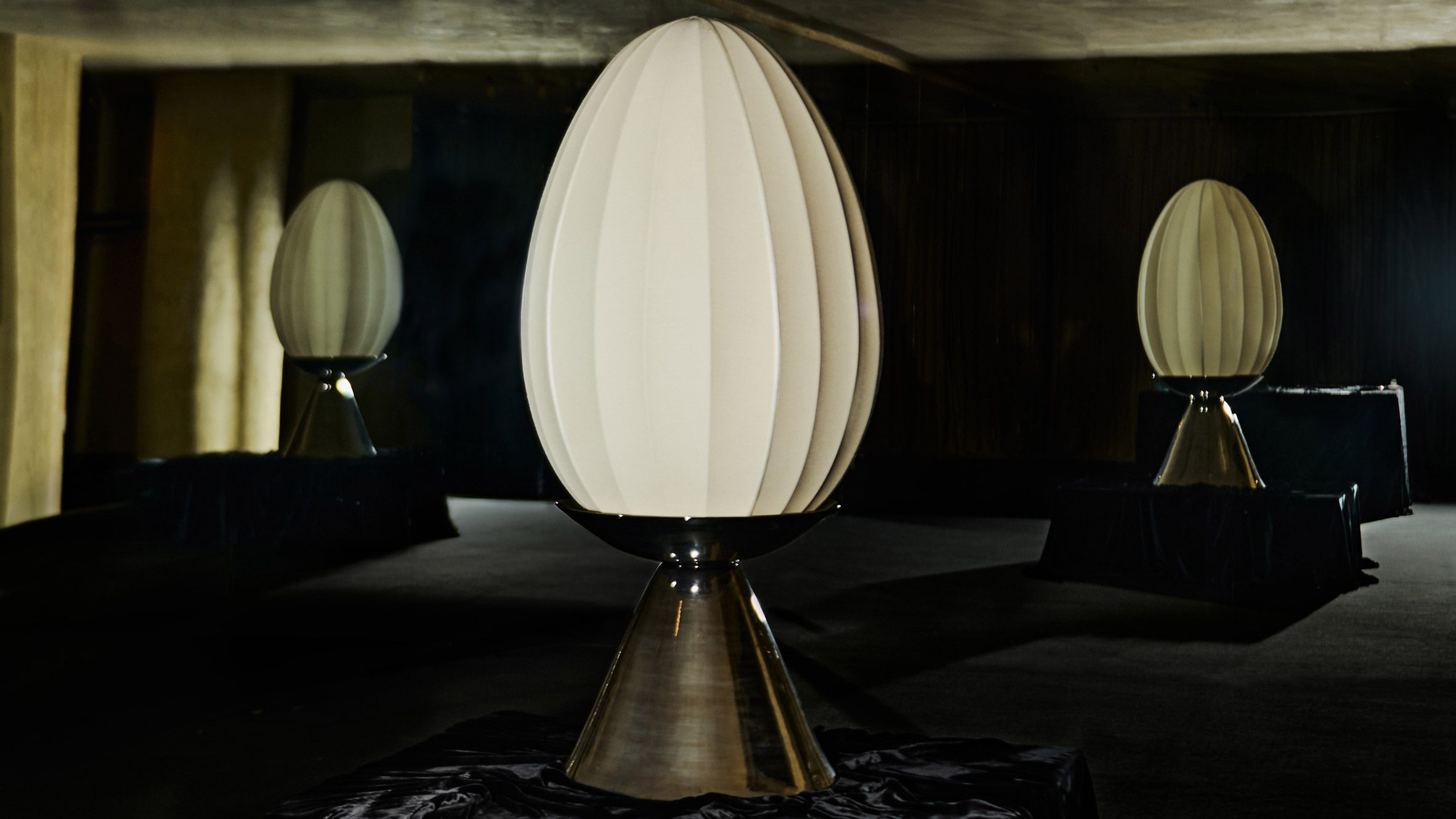 A estilista nova-iorquina Eny Lee Parker revelou luzes gigantes em forma de ovo (imagem superior), cada um apresentado em seu copo, enquanto a marca de moda Chloé fez sua primeira incursão no setor de móveis com a reedição da deliciosa cadeira Tomato dos anos 1970 de Christian Adam (acima).