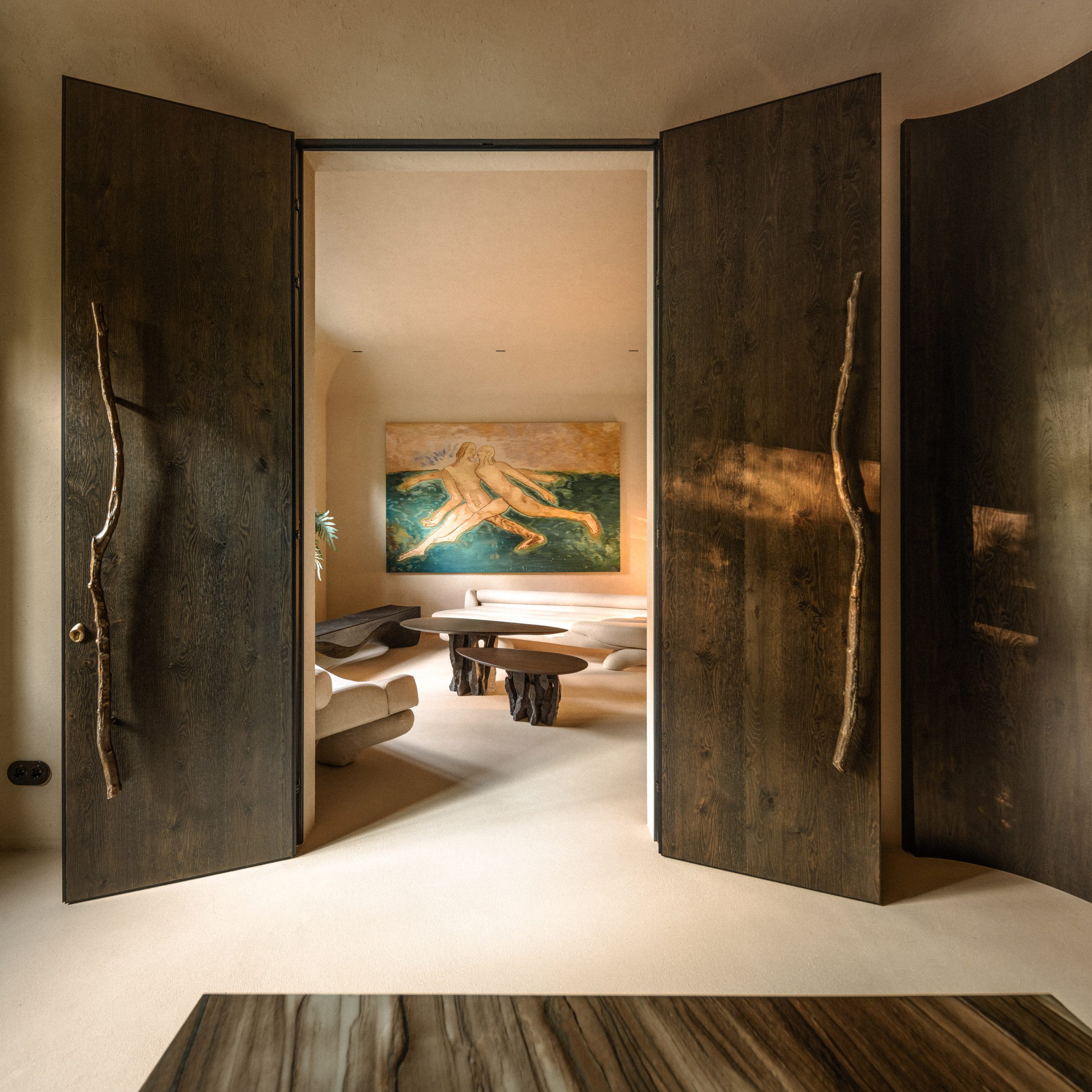 Os assentos esculturais da marca italiana Riva 1920, feitos de madeira maciça recuperada, oferecem lugares adicionais para empoleirar-se e admirar o ceramista Yuriy Sulikovskyesculturas em forma de totem e uma tapeçaria de parede de Sukholit.
