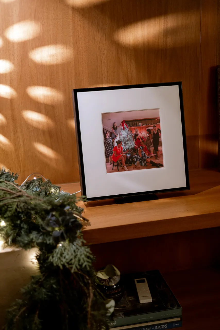 Na sala, a The Frame ganha um papel afetivo. Em vez de uma tela desligada, ela exibe imagens cheias de memória, fotografias que dialogam com o espírito do Natal e com a história que a gente está vivendo ali. Gosto dessa ideia de a tecnologia fazer parte da casa de forma sensível, quase como um quadro que ajuda a contar quem somos.