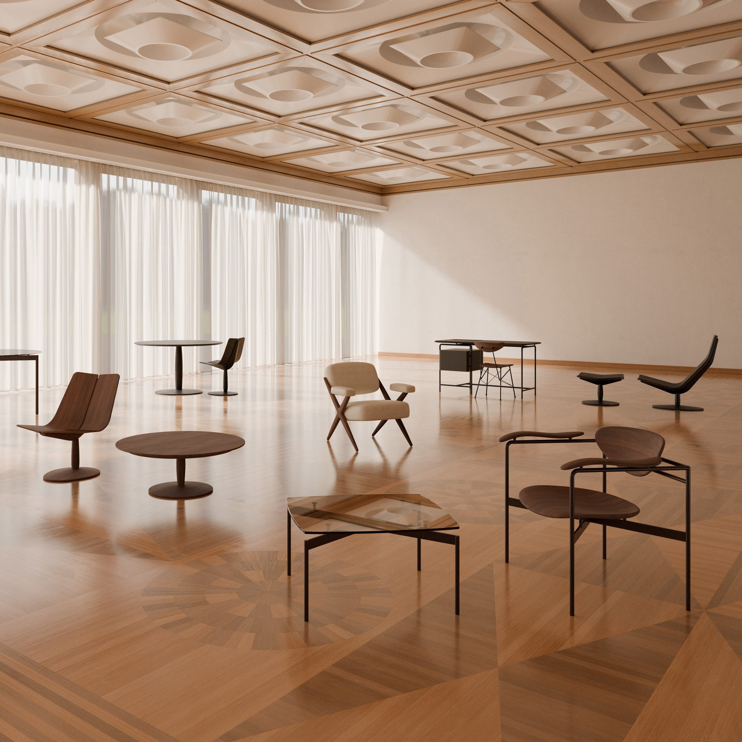 As cadeiras acompanham a mesa baixa VR51, com acabamento nos mesmos materiais. Embora muitas peças da coleção sejam réplicas contemporâneas dos protótipos existentes do arquiteto, a mesa é uma das várias peças novas que Prostoria concebeu para imitar a linguagem de design de Richter.