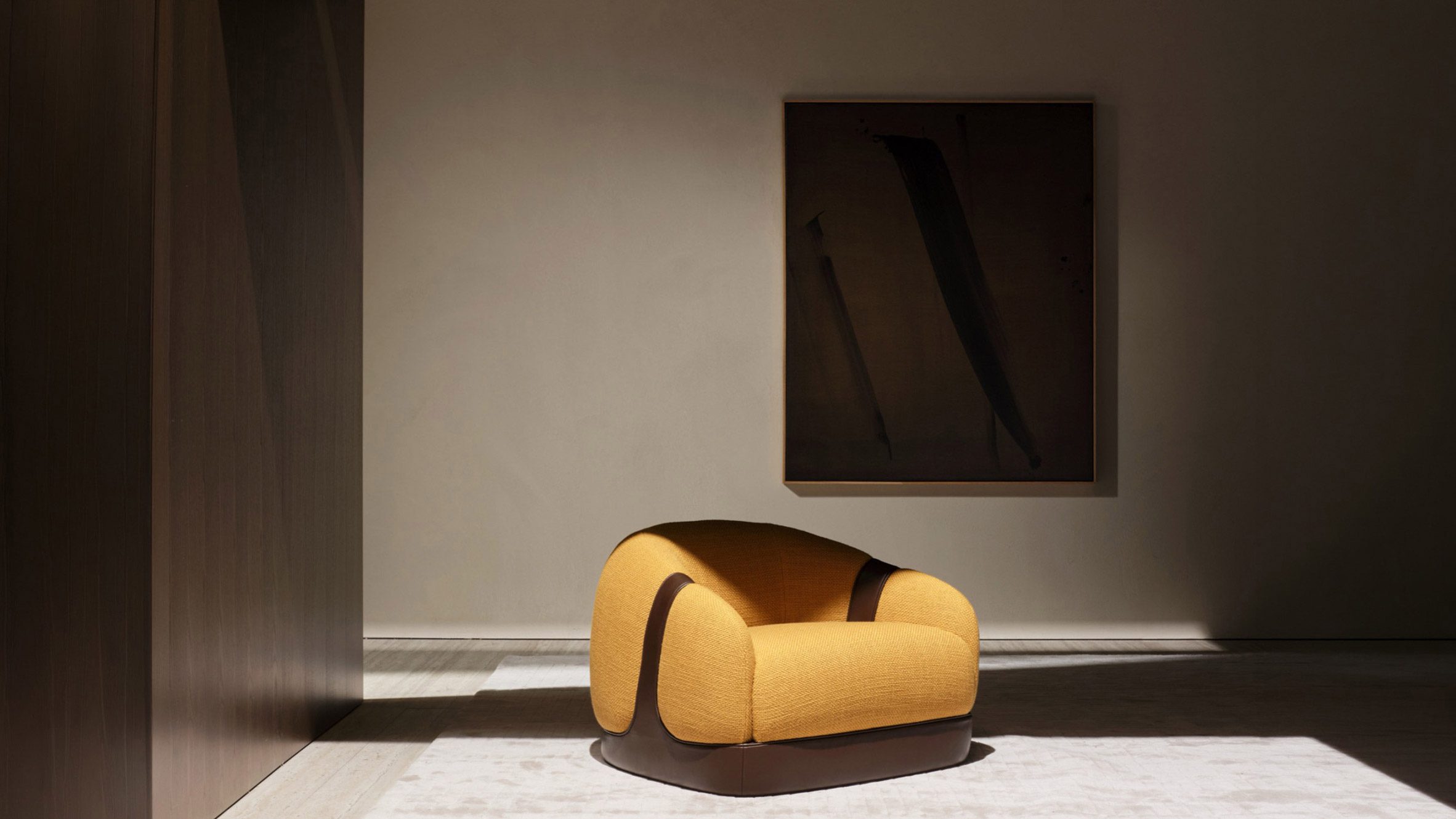 Showroom Dezeen: um cinto de couro aperta o formato almofadado desta poltrona criada pelo designer argentino Cristián Mohaded para a marca italiana de móveis Molteni&C.