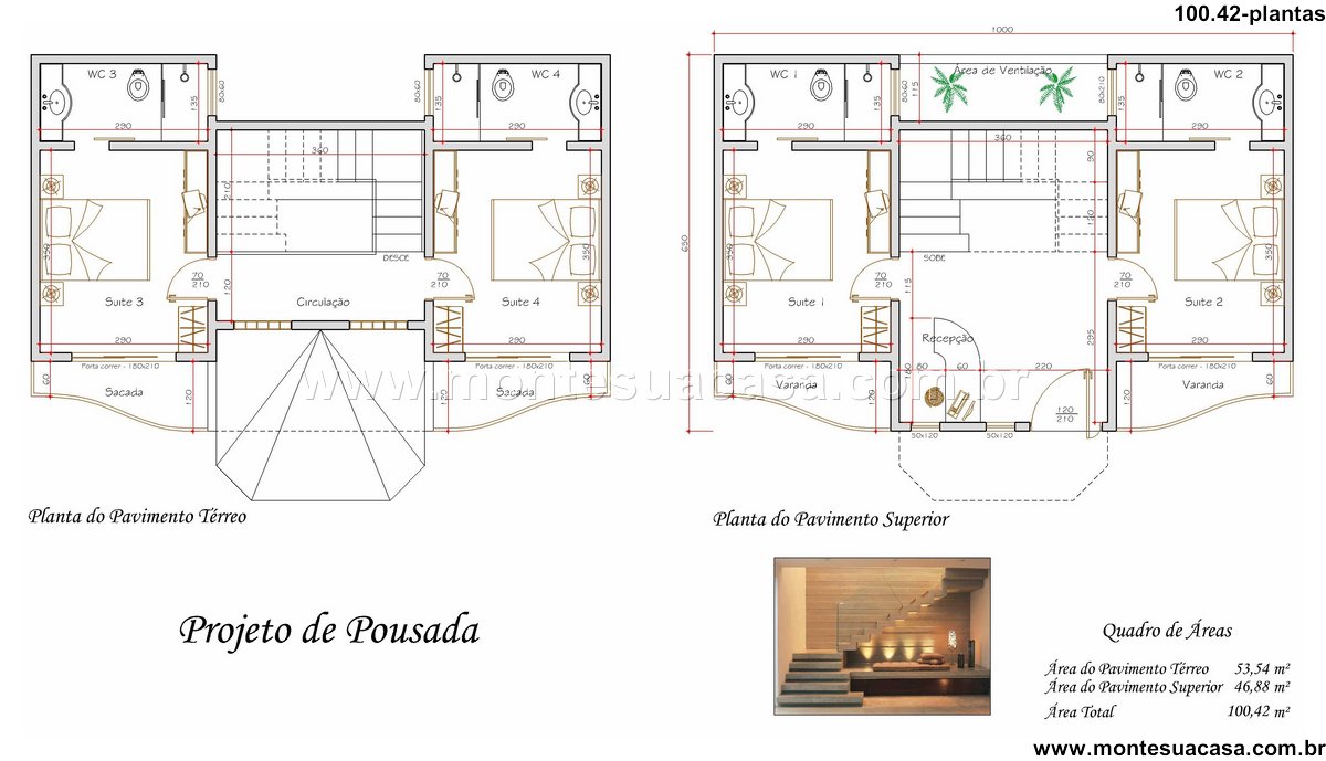 Este projeto de pousada foi desenvolvido para oferecer conforto, funcionalidade e charme em uma área compacta de 100,42m². Com dois pavimentos bem distribuídos, a proposta atende perfeitamente empreendimentos voltados à hospedagem em regiões turísticas ou urbanas. A planta térrea contempla duas suítes com banheiros privativos, sacada e circulação eficiente, garantindo privacidade e fluidez entre os ambientes. Já o pavimento superior abriga outras duas suítes, além de uma recepção acolhedora e uma área de ventilação com vegetação, que contribui para o bem-estar dos hóspedes.