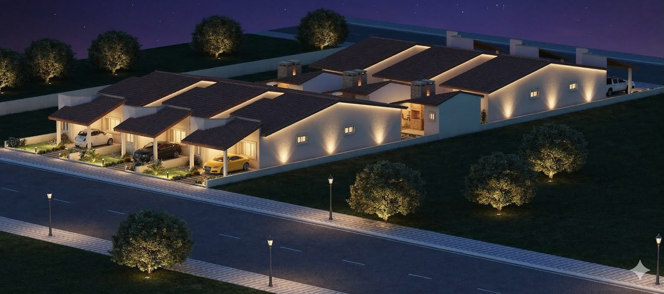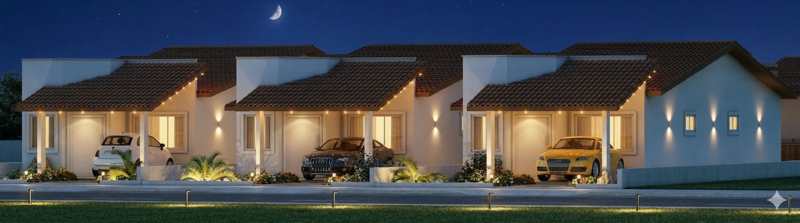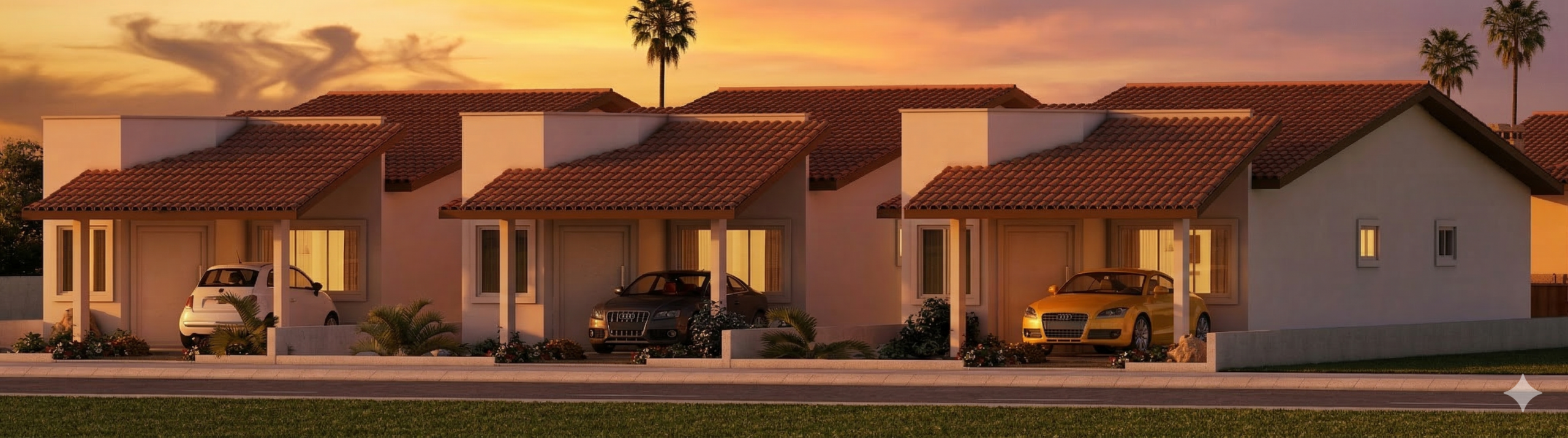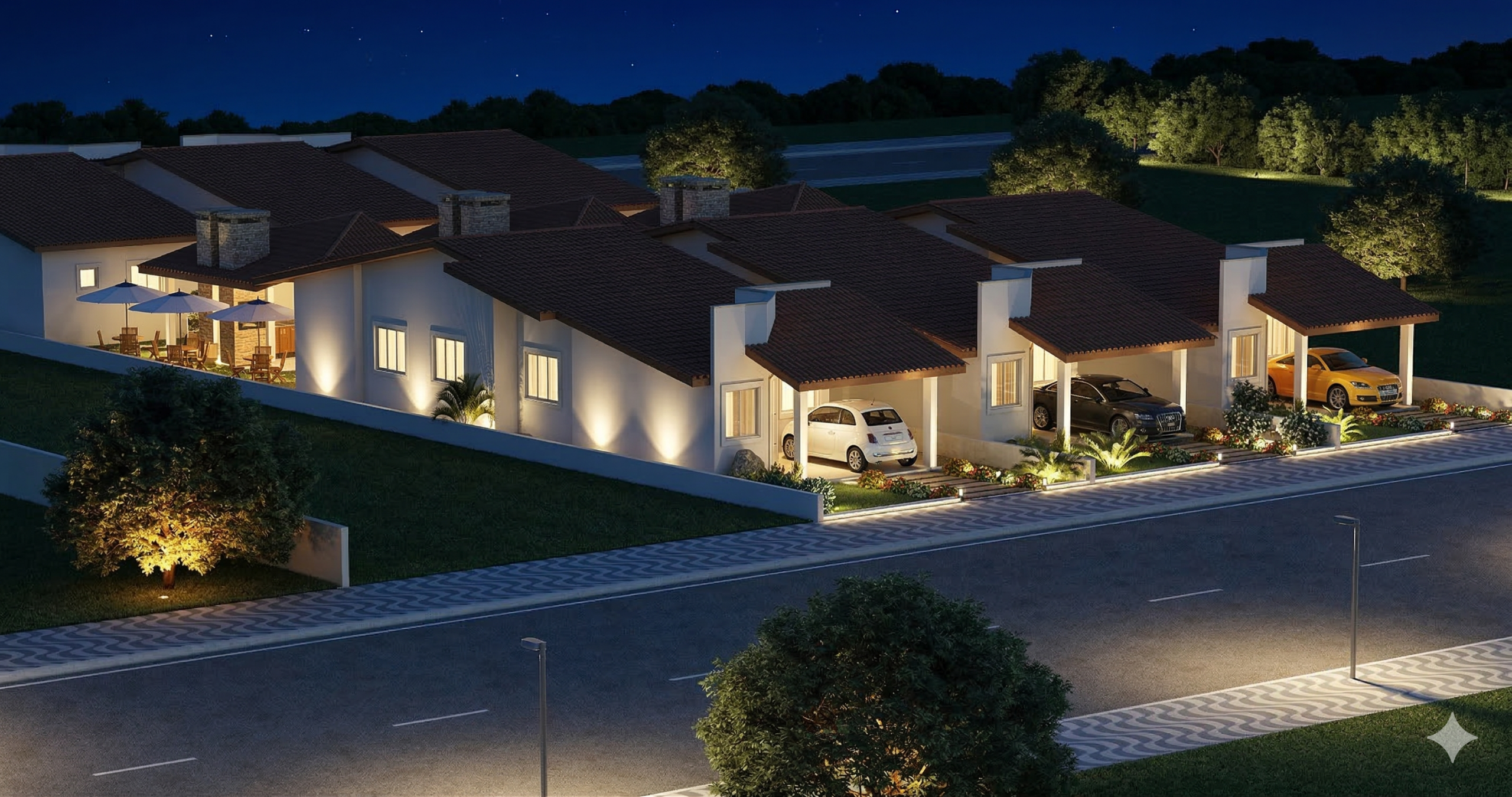 A fachada valoriza linhas simples e equilibradas, com volumes bem definidos e telhado cerâmico aparente que traz charme e elegância. Cada unidade conta com garagem coberta para um veículo, jardim frontal e detalhes que destacam a harmonia entre funcionalidade e beleza.