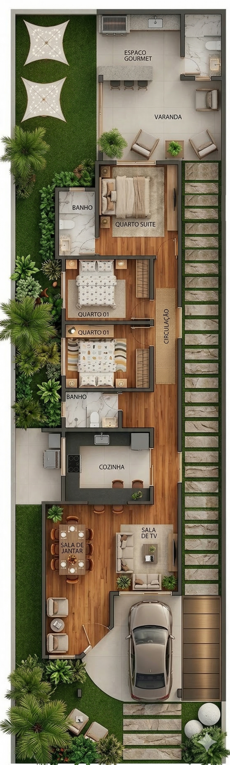 O layout interno foi projetado para oferecer praticidade e integração dos ambientes. A área social é composta por sala de estar e jantar integradas, garantindo amplitude visual e iluminação natural. A cozinha funcional se conecta à área gourmet no fundo do terreno, criando um espaço perfeito para lazer e convivência em família.
