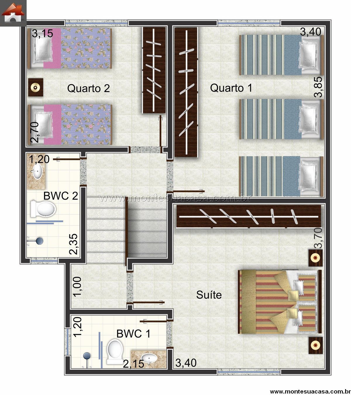 O pavimento superior concentra a área íntima da residência, composta por três dormitórios. A suíte principal é espaçosa e possui banheiro privativo, garantindo conforto e privacidade ao casal. Os dois quartos adicionais oferecem excelente espaço para crianças ou hóspedes, com fácil acesso ao banheiro social.
