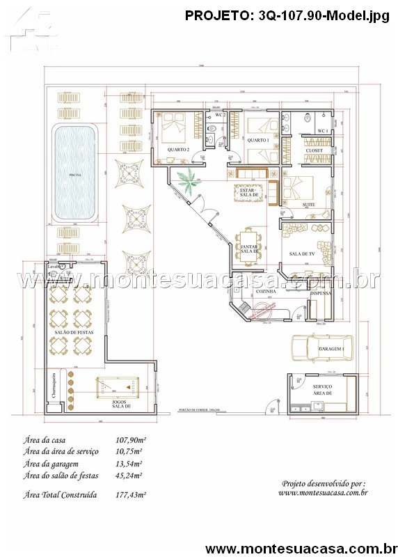 O projeto residencial de 107,90m² foi desenvolvido para famílias que buscam conforto, funcionalidade e uma área social completa. O destaque deste modelo é o salão de festas com piscina, ideal para reunir amigos e familiares em um ambiente acolhedor e descontraído.