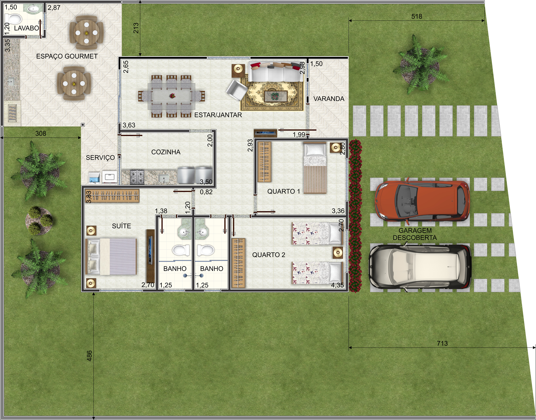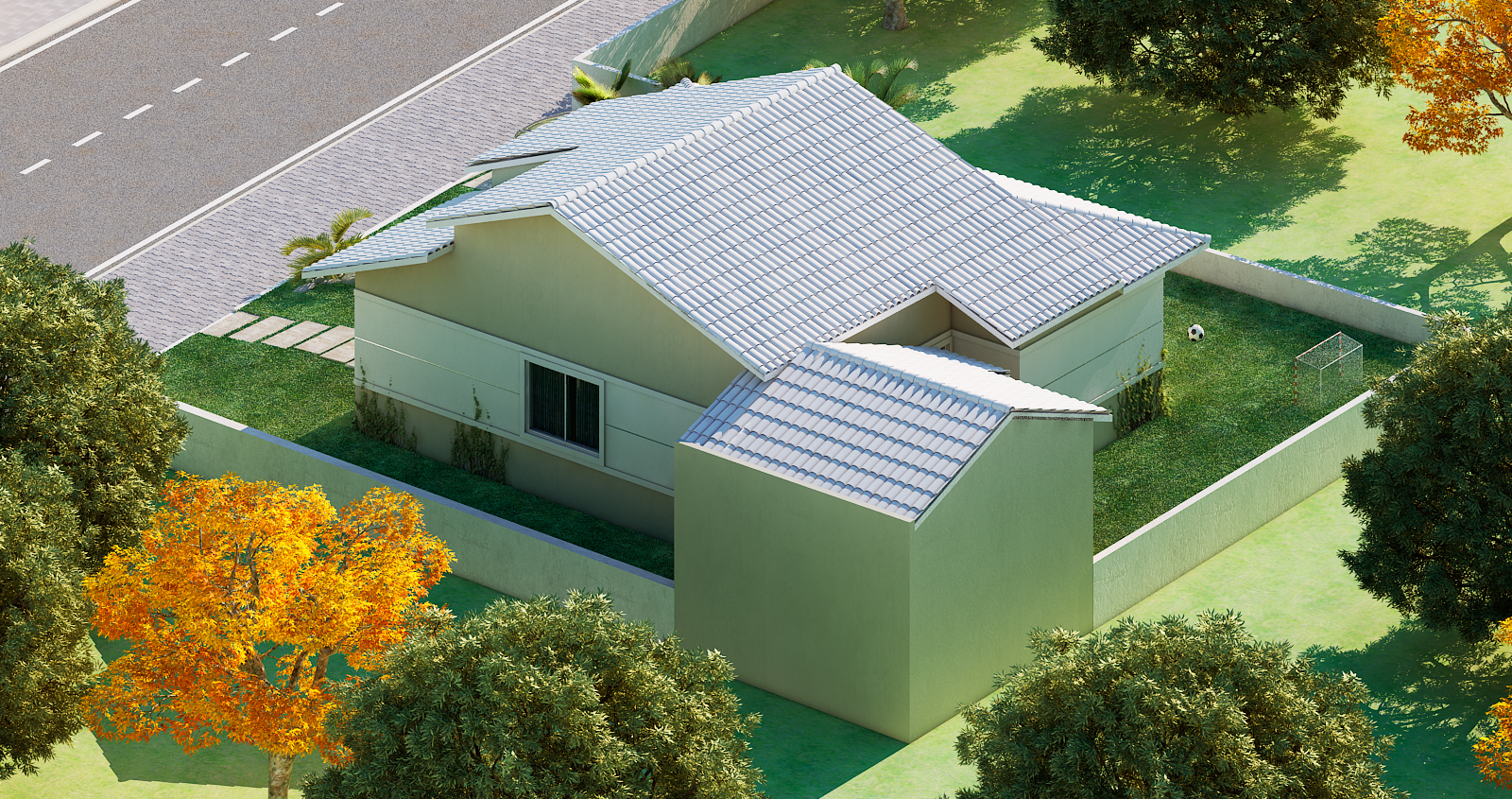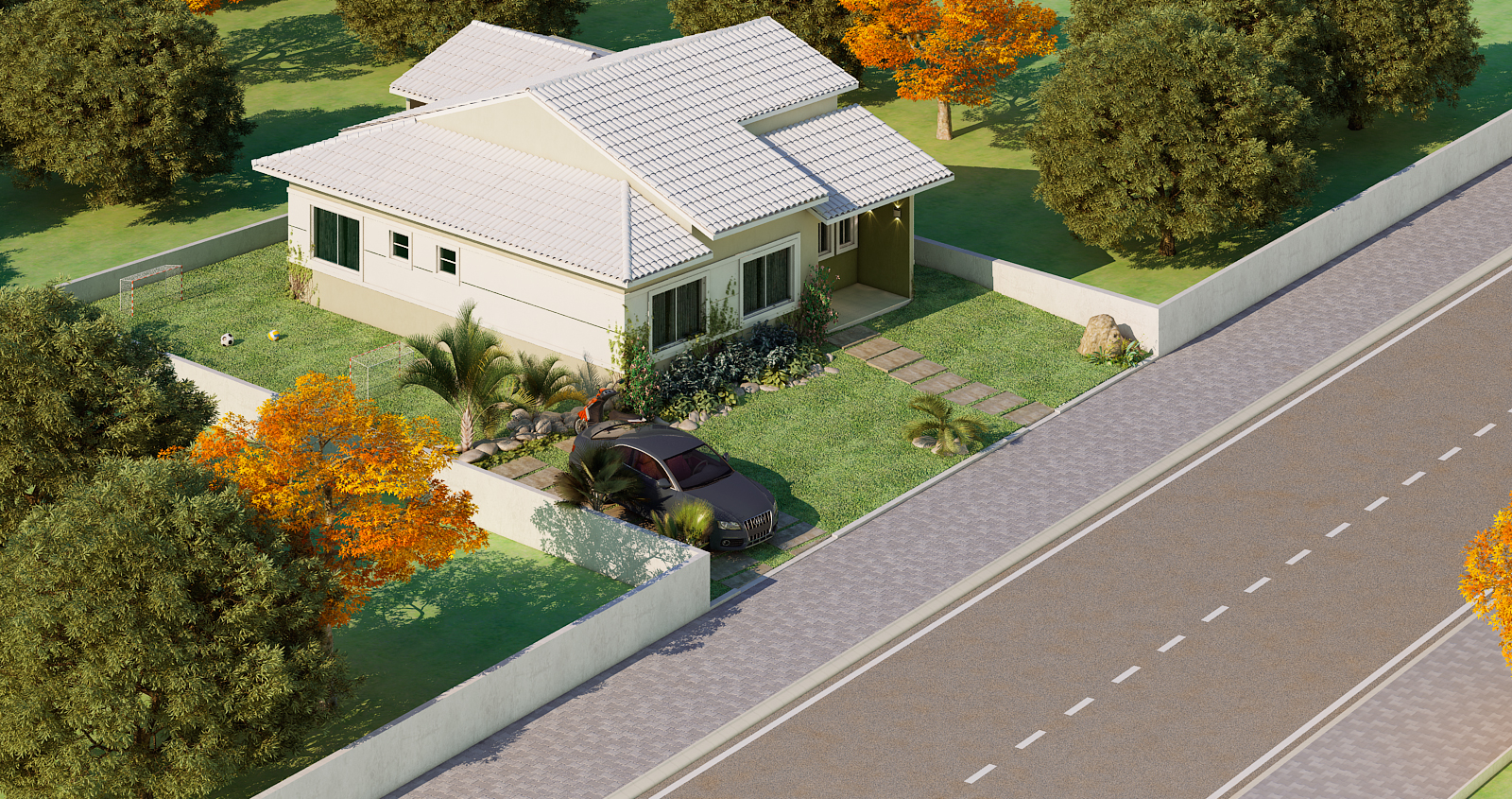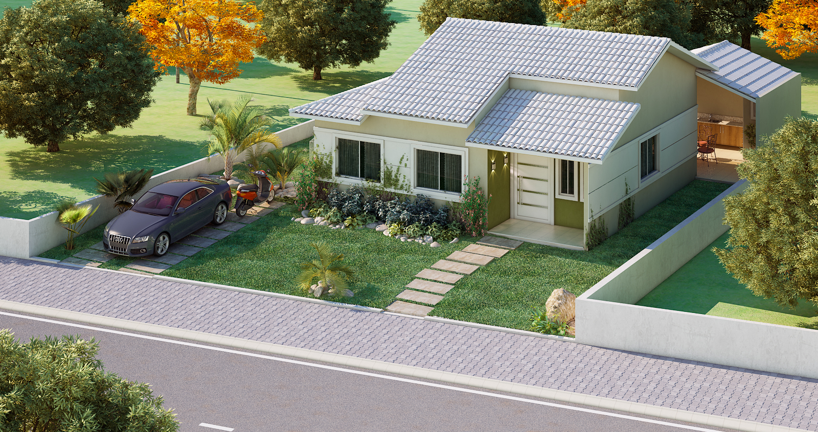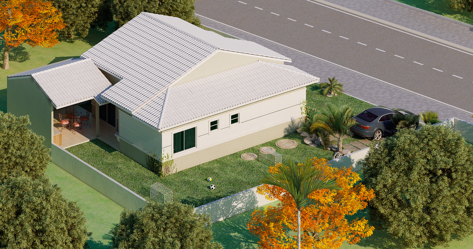 O lavabo social é um grande trunfo, oferecendo comodidade para os visitantes sem acessar a área íntima da casa. A área de serviço é bem localizada, com fácil acesso à cozinha e à saída para a área externa, otimizando a rotina doméstica. O projeto preza por detalhes como pontos de iluminação específica e tomadas estrategicamente posicionadas. A integração visual é mantida através de um piso que se estende pela maioria dos ambientes, unificando os espaços. A casa possui grande potencial de personalização para refletir o gosto único dos moradores. Este projeto é a definição de moradia moderna, funcional e acolhedora.