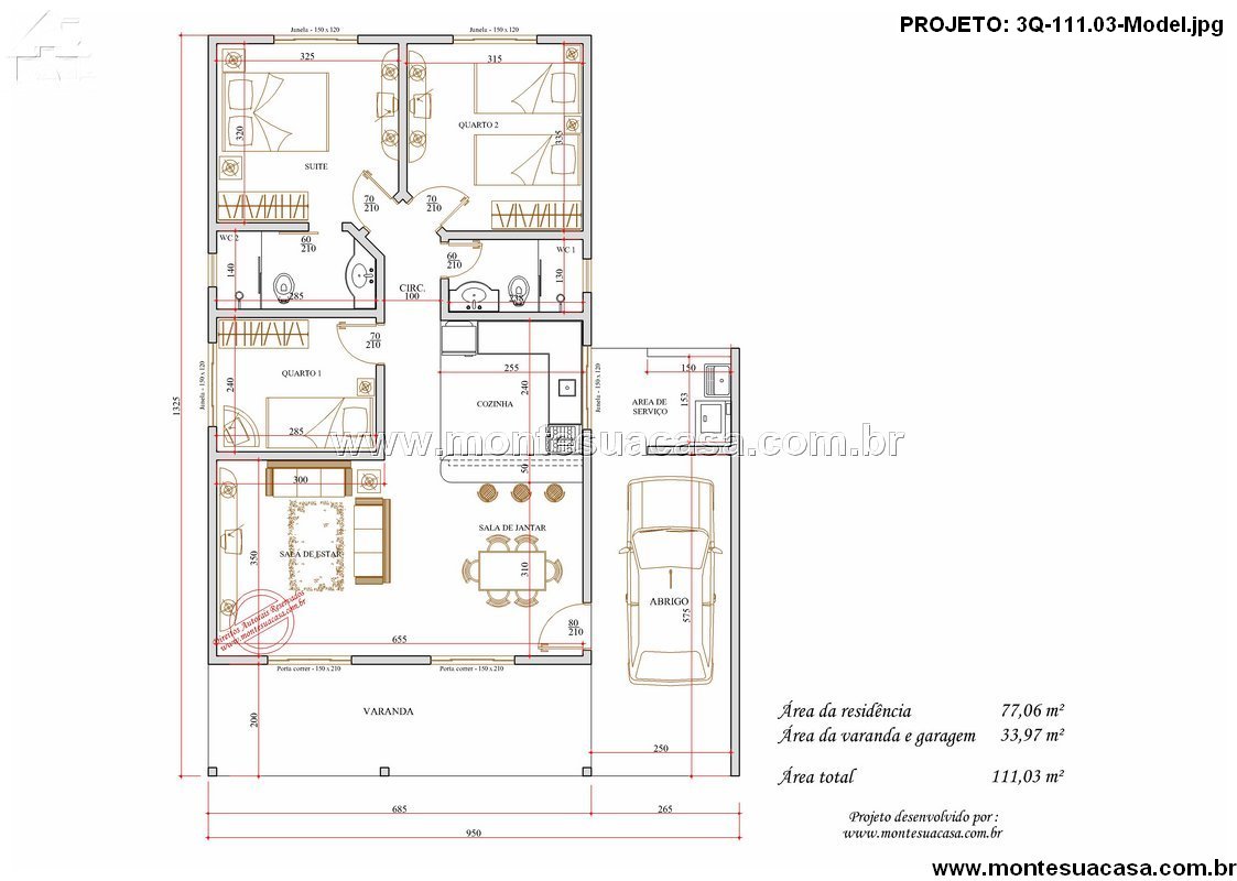 O projeto Casa Térrea 3 Quartos – 111,03m² combina praticidade, conforto e design contemporâneo em um layout bem distribuído. Com 77,06m² de área residencial e 33,97m² de varanda e garagem, totalizando 111,03m², esta planta foi pensada para famílias que buscam funcionalidade sem abrir mão do charme e da integração entre os ambientes.