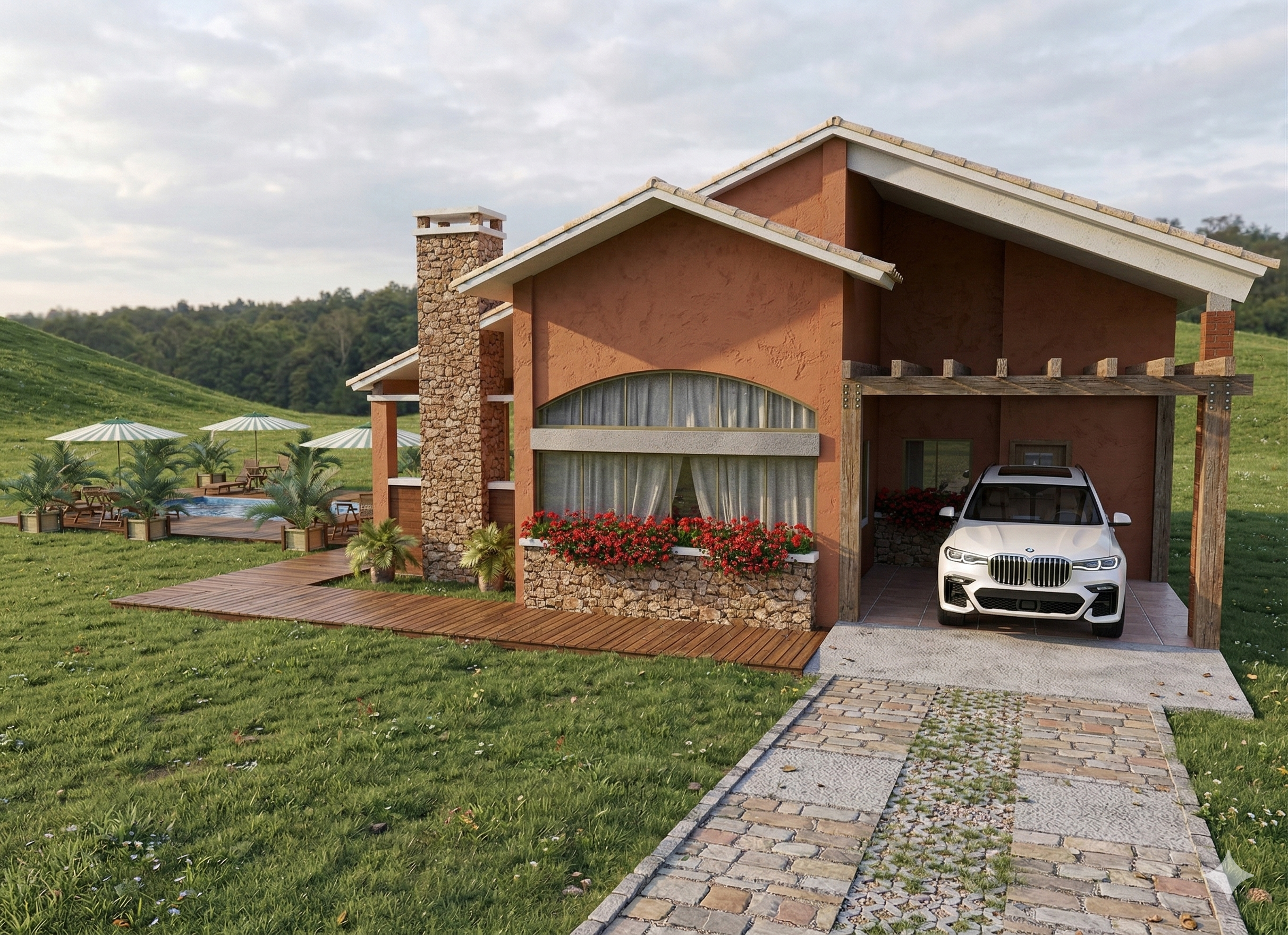 O Projeto 2Q-111.10 apresenta uma casa térrea moderna com 111,10 m² de área construída, ideal para quem busca conforto e lazer em um único espaço. O design combina linhas contemporâneas com elementos naturais, como revestimentos em pedra e madeira, que criam um ambiente acolhedor e sofisticado. O telhado cerâmico em tons neutros harmoniza perfeitamente com a fachada em tons terrosos, transmitindo equilíbrio e charme.