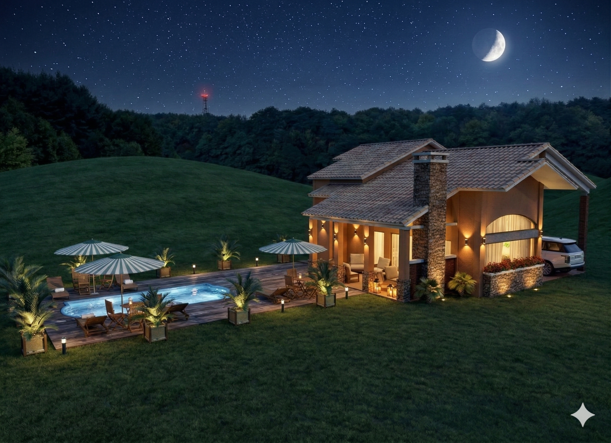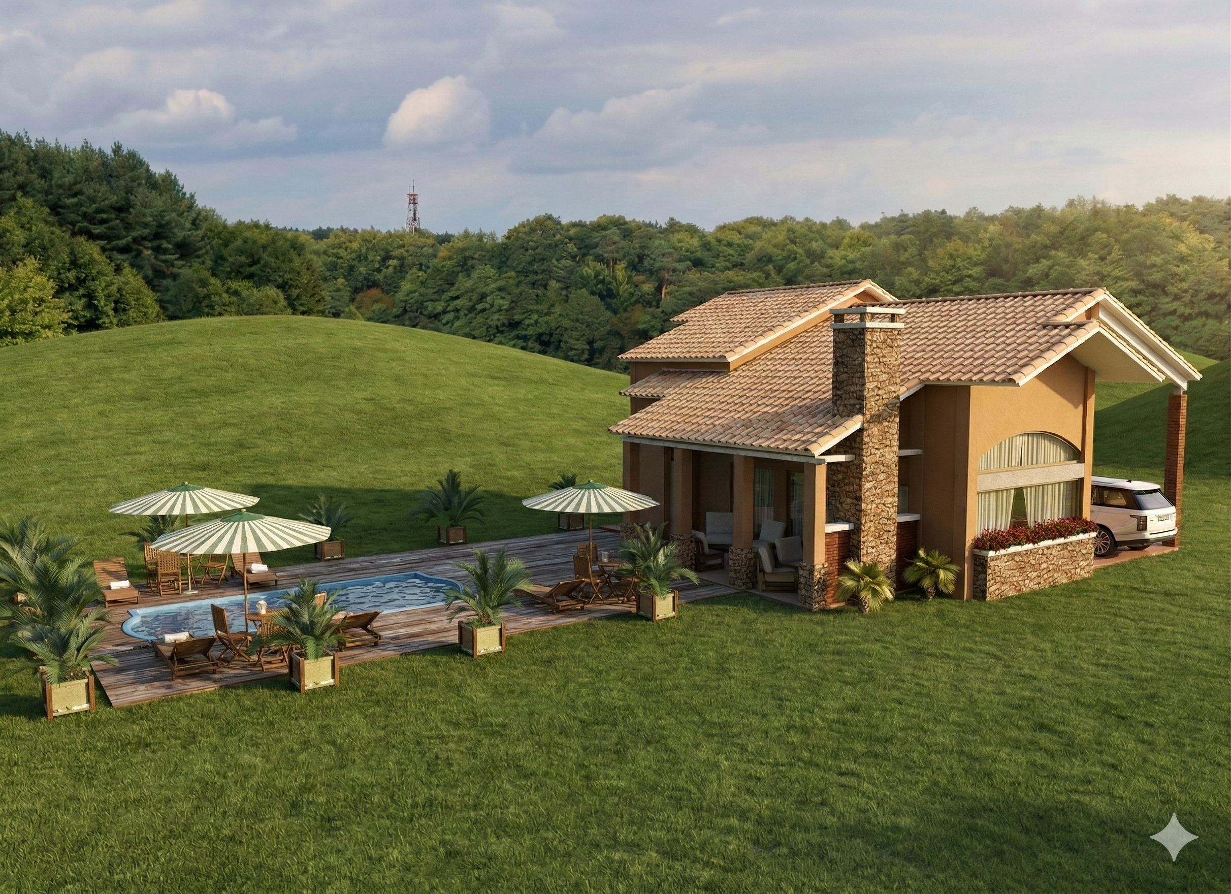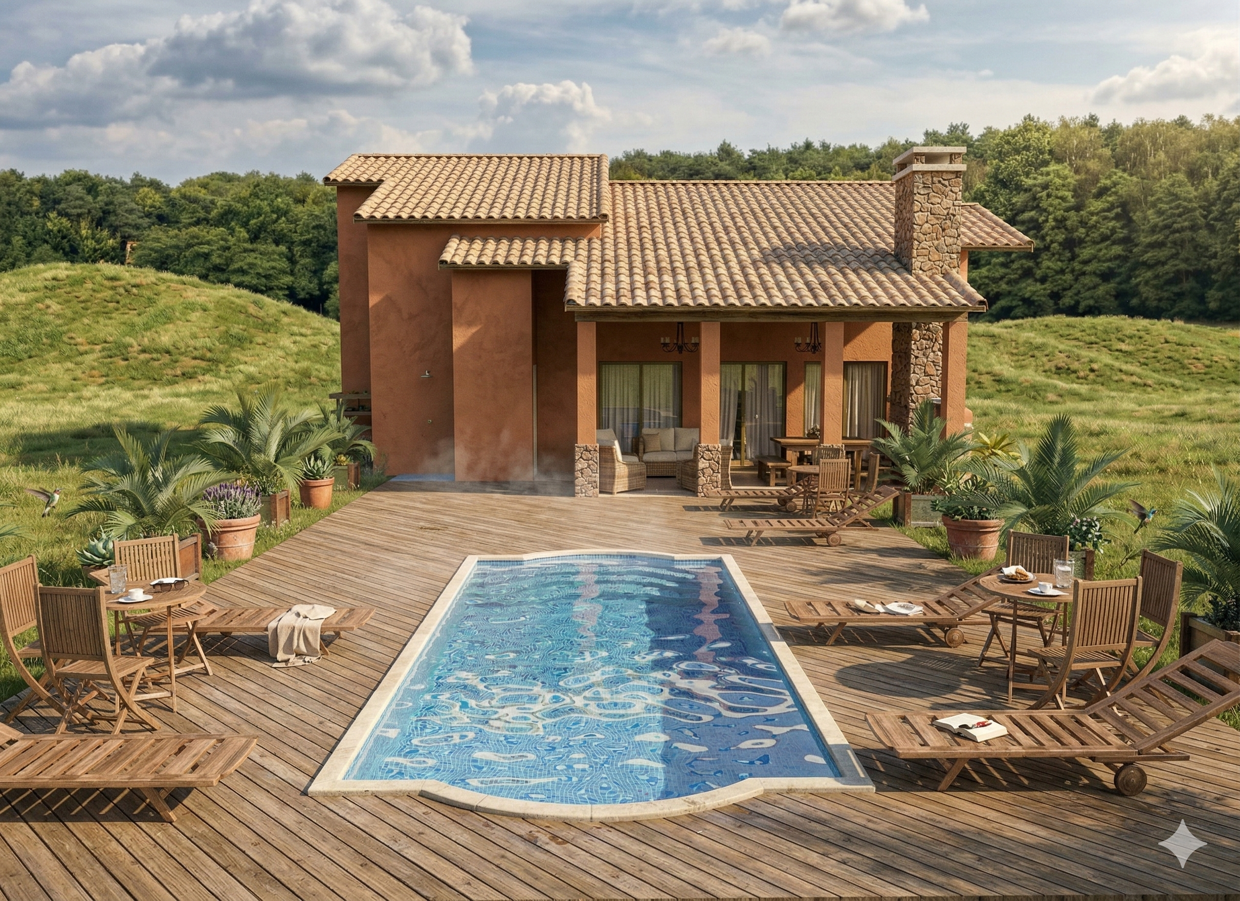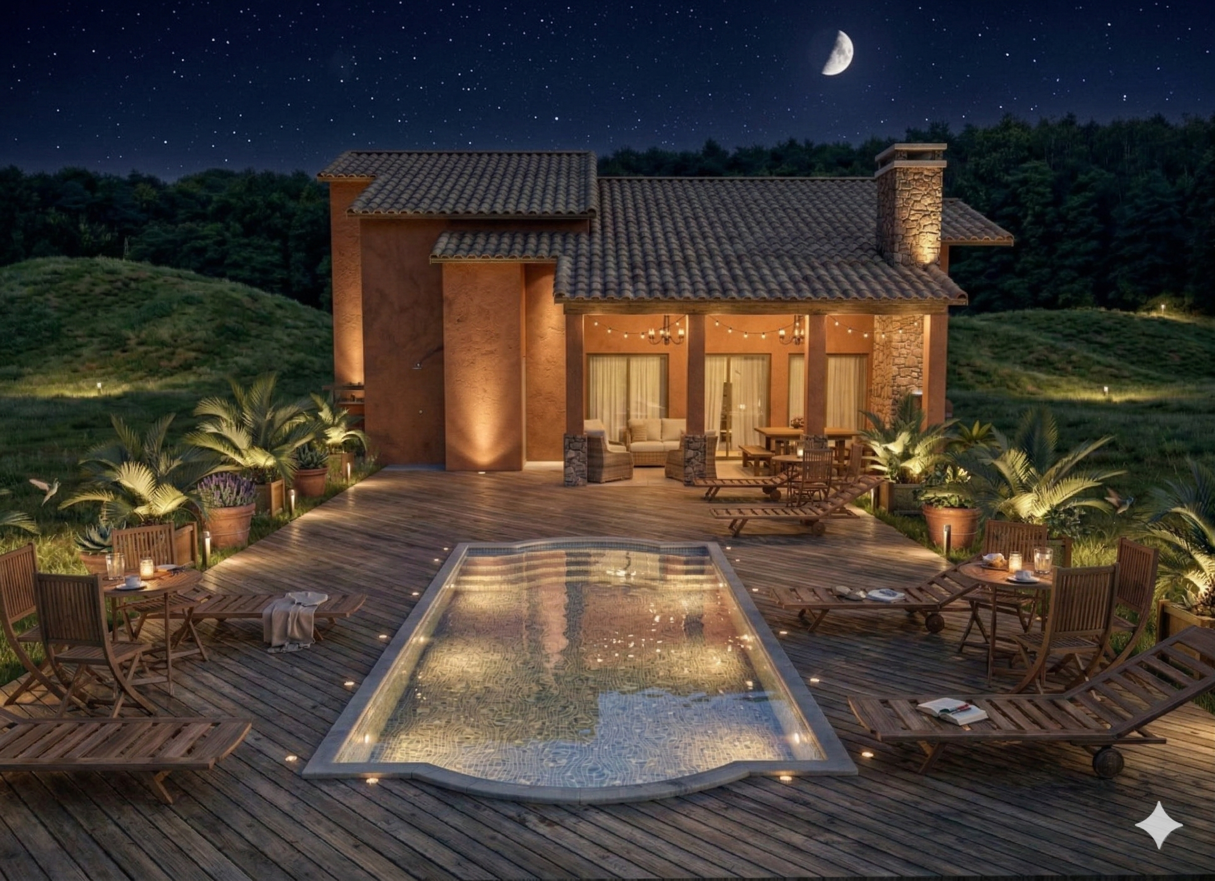 A ampla varanda coberta com lareira conecta-se de forma fluida à sala de estar e à área gourmet, criando um espaço perfeito para reunir familiares e amigos. A área externa é o destaque do projeto, com um deck de madeira e uma piscina central cercada por espreguiçadeiras e ombrelones, proporcionando momentos de relaxamento e lazer ao ar livre.