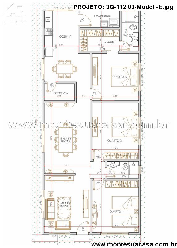 A cozinha é ampla e funcional, com acesso direto à despensa e à lavanderia, o que facilita a organização da rotina doméstica. Já na parte íntima, o projeto conta com três quartos confortáveis, sendo um deles uma suíte com closet, proporcionando mais privacidade e conforto ao casal. Os outros dois dormitórios são ideais para filhos ou para uso como escritório ou quarto de hóspedes.