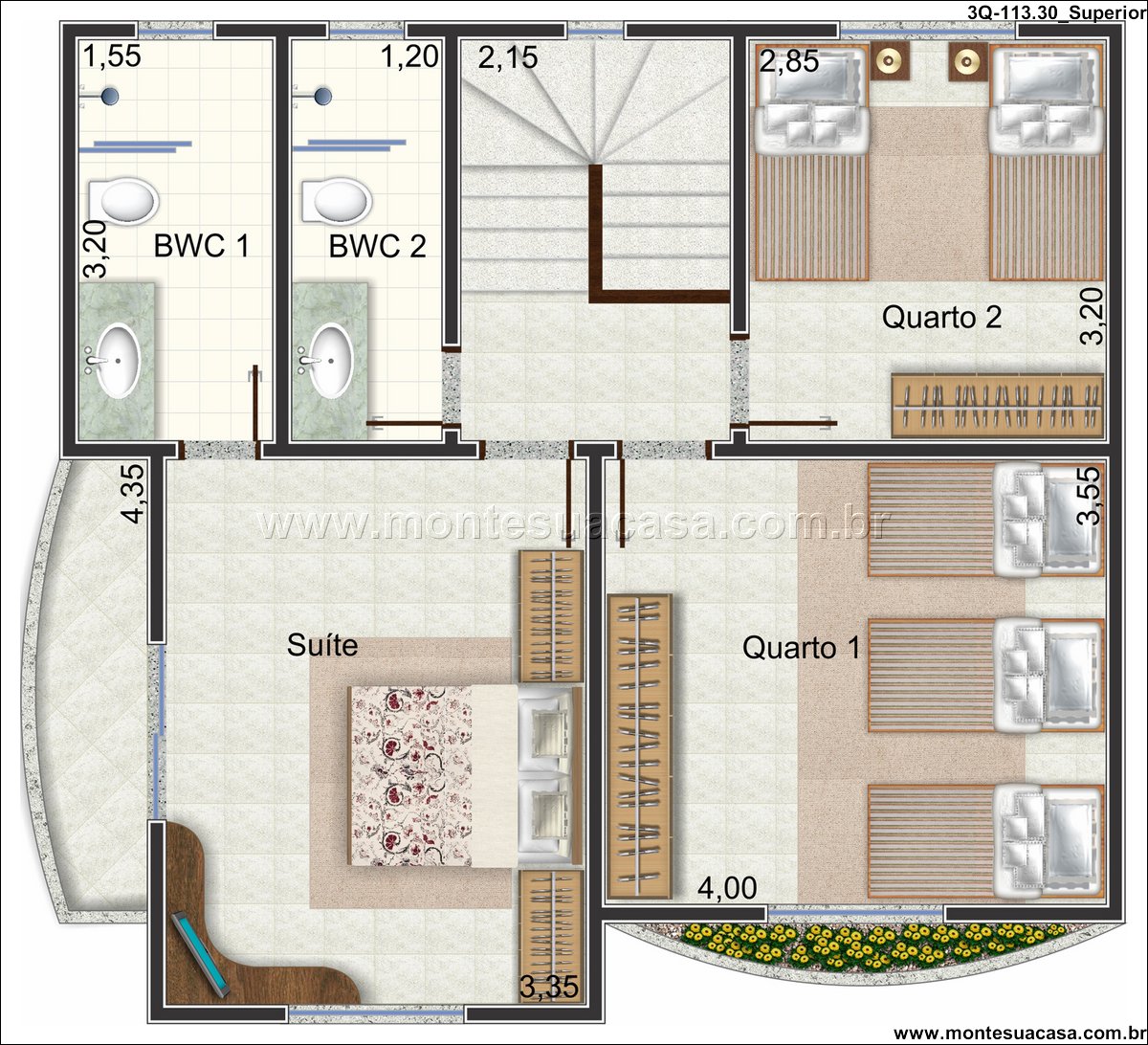 Área íntima bem distribuída no pavimento superior No andar superior, a casa apresenta três dormitórios bem dimensionados. A suíte principal possui sacada privativa e espaço para cama de casal e poltronas, oferecendo um refúgio tranquilo. Os quartos adicionais, Quarto 1 e Quarto 2, acomodam até cinco camas no total, sendo ideais para filhos, hóspedes ou até mesmo um home office. Dois banheiros completos (BWC 1 e BWC 2) atendem aos dormitórios com praticidade e conforto. A circulação entre os ambientes é facilitada por uma escada central, que organiza o fluxo interno da casa.