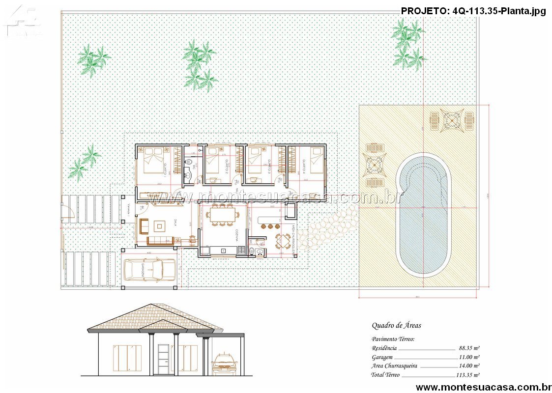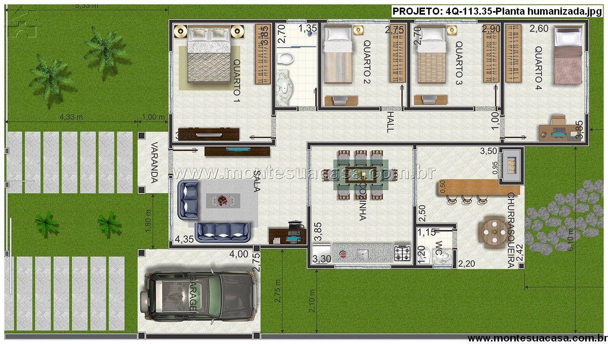 Projeto residencial térreo de 113.35 m², perfeito para famílias, integrando conforto, funcionalidade e um ótimo espaço para entretenimento.