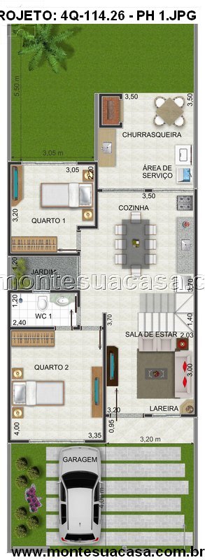 O projeto não negligencia as necessidades práticas, incluindo uma específica Área de Serviços de 3.20m. Esta área garante organização e funcionalidade para as tarefas domésticas. Destaque para a Churrasqueira, um espaço dedicado ao lazer e a receber amigos e familiares em momentos especiais. A Garagem, com 3.20m de dimensão, proporciona o resguardo seguro para o veículo, completando as comodidades desta residência.