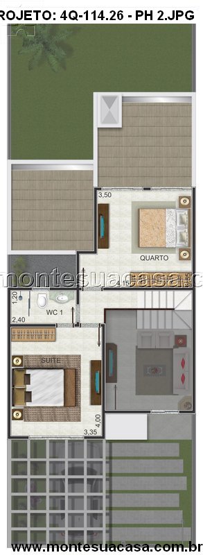 A zona privativa é composta por 4 quartos generosos. O Quarto 1 conta com uma varanda privativa (Maromi), adicionando um charme especial e um espaço extra de relaxamento. O Quarto 2, com 3.21m, também oferece amplo espaço para mobiliário. Ambos os cômodos são servidos por um WC bem localizado, assegurando privacidade e comodidade para os residentes. Os ambientes são iluminados e ventilados naturalmente, criando um refúgio perfeito.