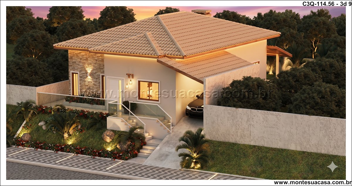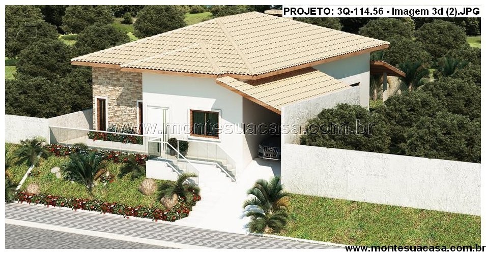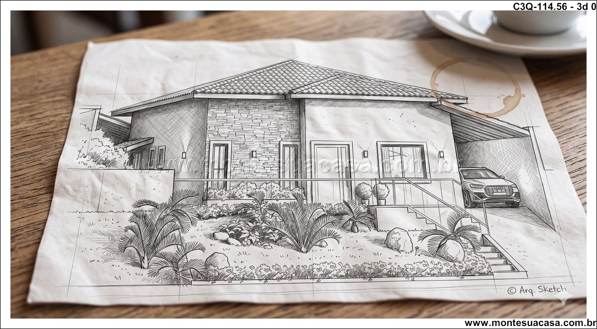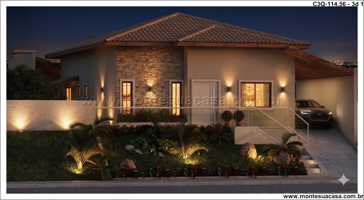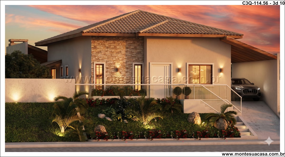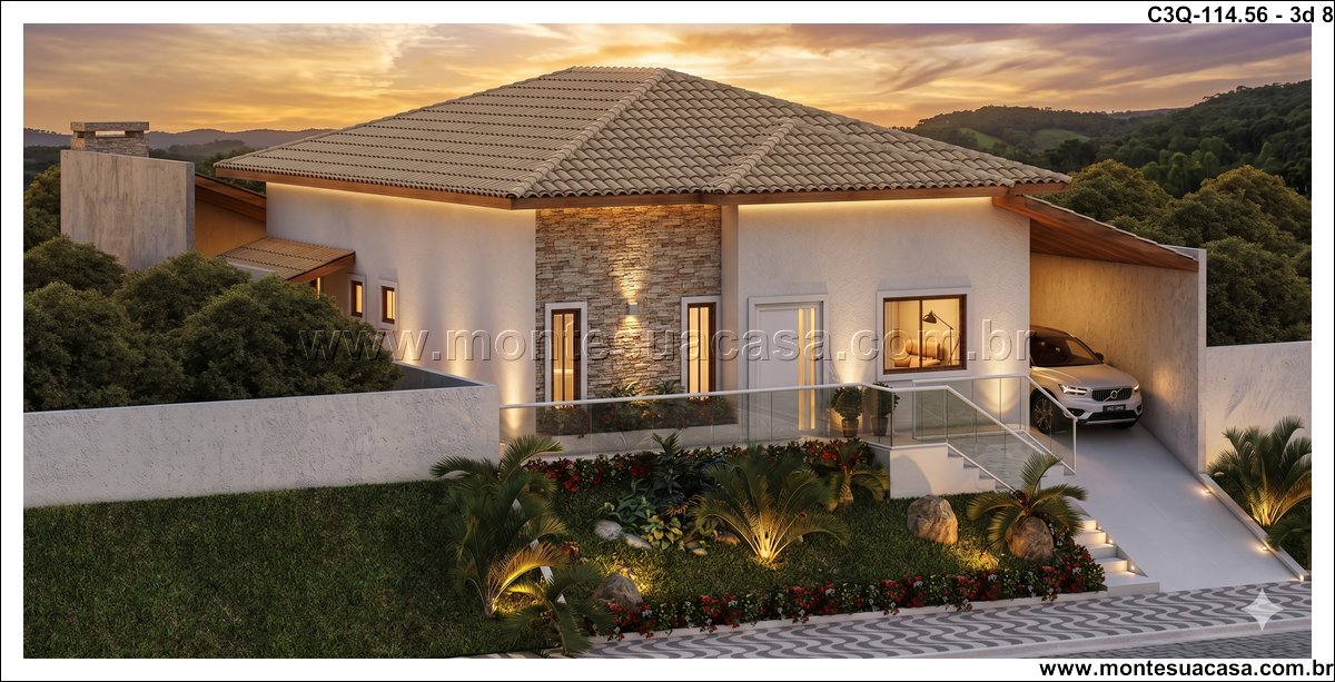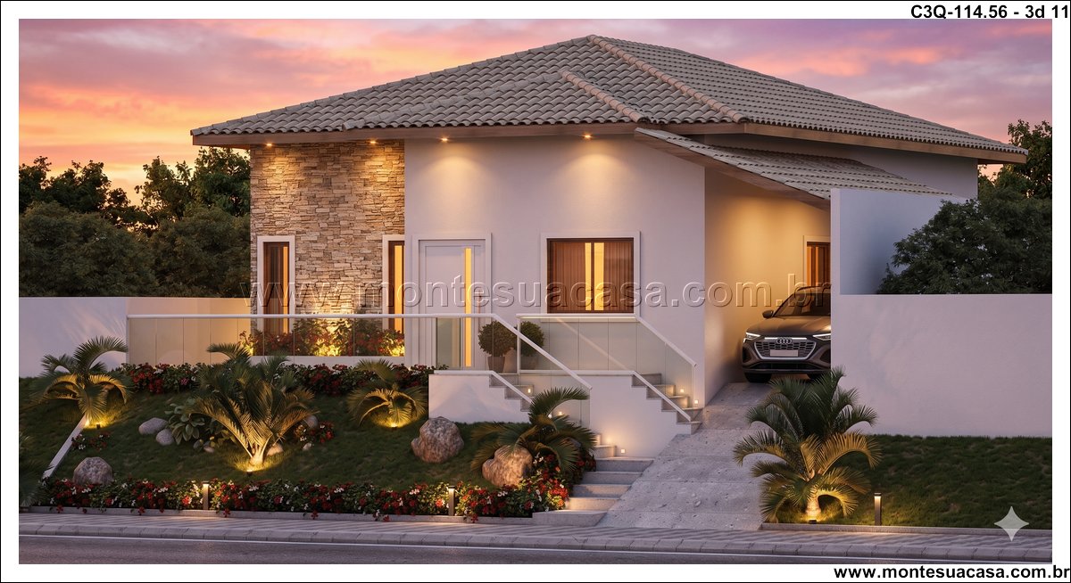 O projeto 3Q-114.56 é uma casa térrea moderna e acolhedora, ideal para famílias que valorizam conforto e integração entre os ambientes. Com 114,56 m², o projeto combina elegância e funcionalidade em cada detalhe, oferecendo uma fachada charmosa com revestimento em pedra natural e telhado cerâmico de quatro águas, que conferem sofisticação e harmonia ao conjunto arquitetônico.