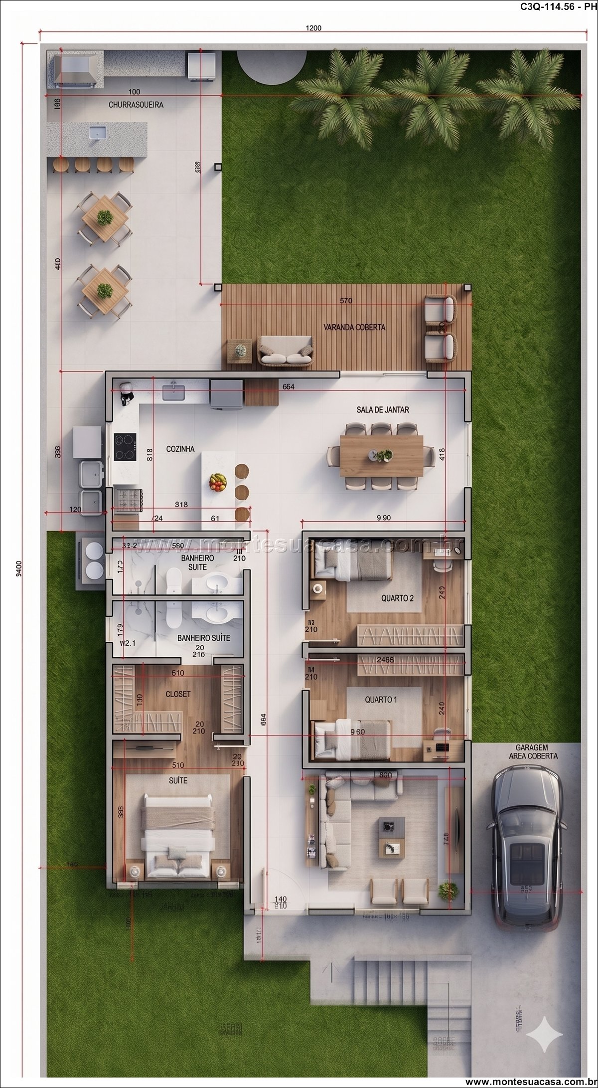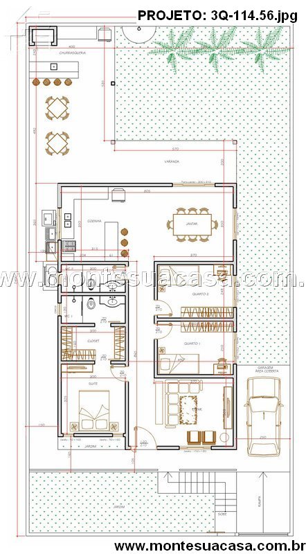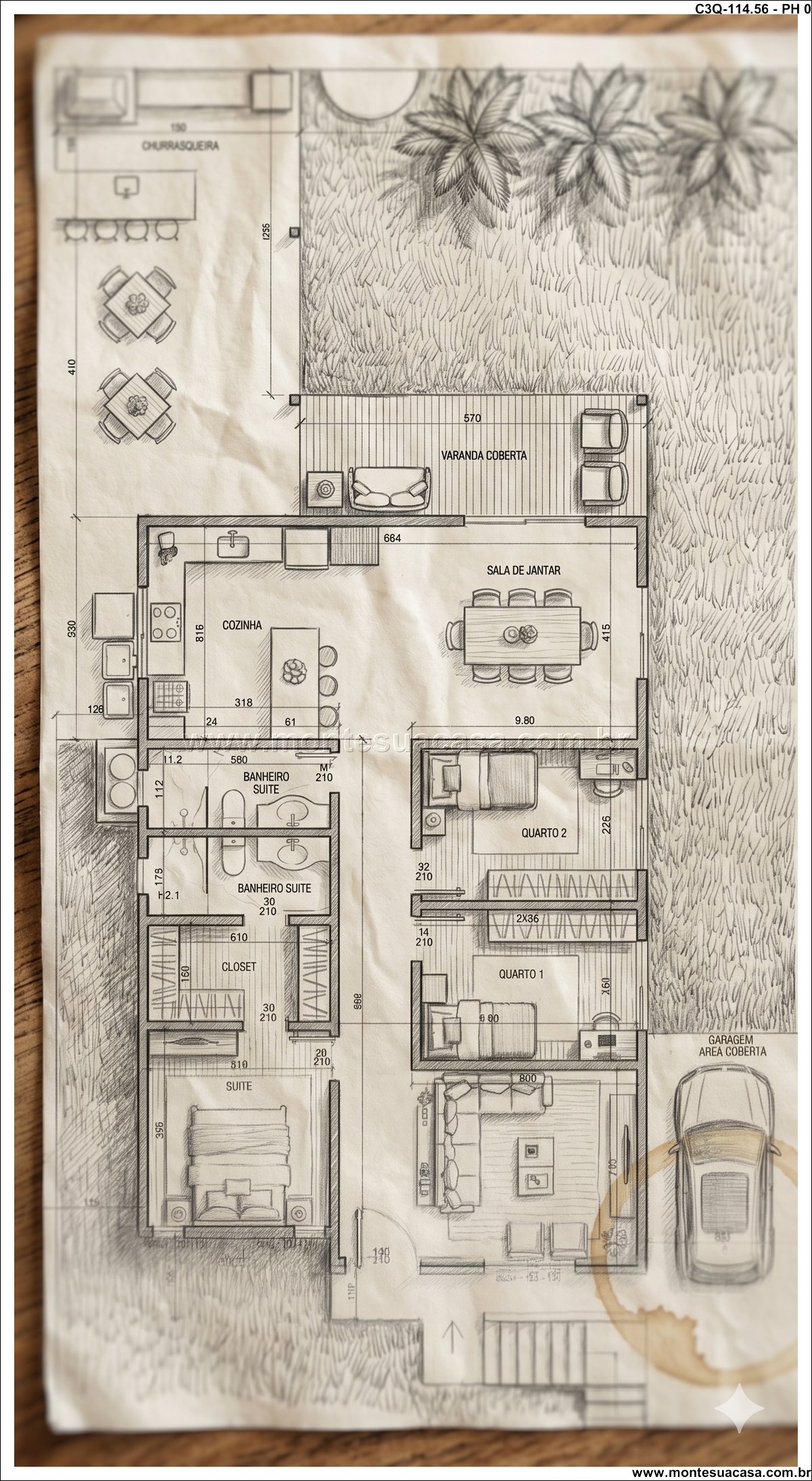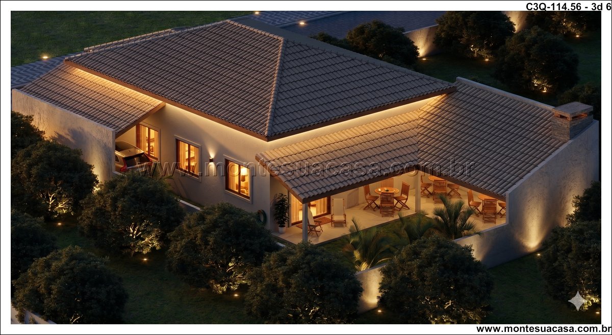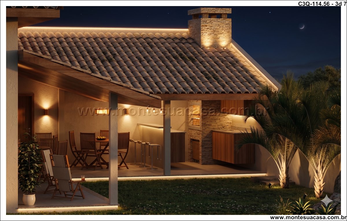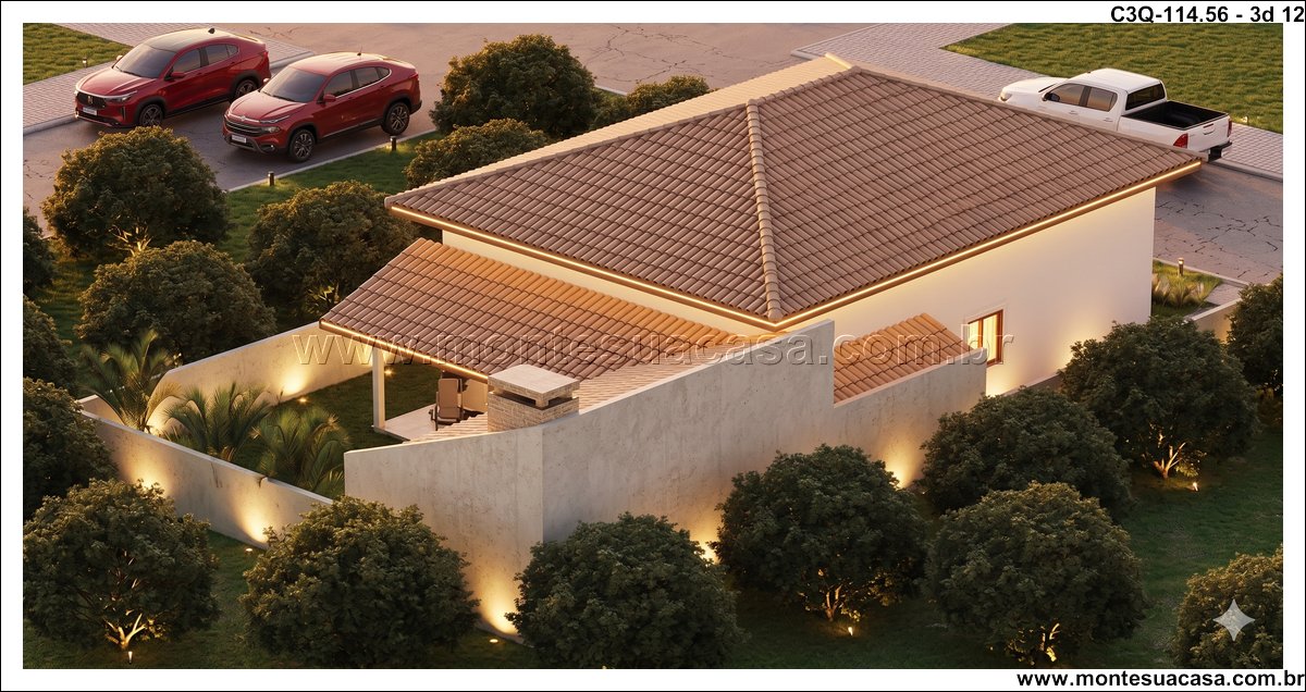 O projeto 3Q-114.56 é uma casa térrea moderna e acolhedora, ideal para famílias que valorizam conforto e integração entre os ambientes. Com 114,56 m², o projeto combina elegância e funcionalidade em cada detalhe, oferecendo uma fachada charmosa com revestimento em pedra natural e telhado cerâmico de quatro águas, que conferem sofisticação e harmonia ao conjunto arquitetônico.