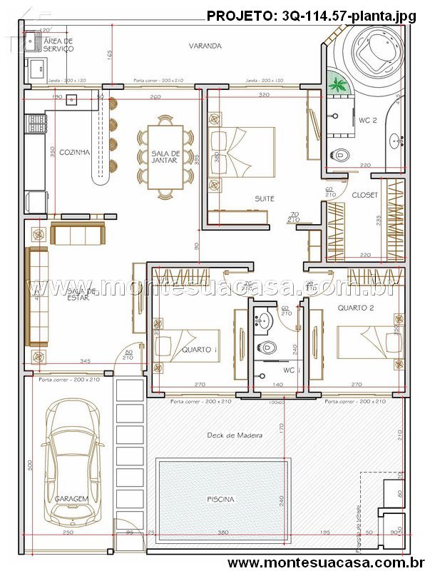 Este projeto de casa térrea com 114,57 m² apresenta um design contemporâneo e funcional, ideal para famílias que valorizam conforto, praticidade e integração entre os espaços. A fachada combina telhas cerâmicas e detalhes em tijolo aparente, transmitindo elegância e acolhimento. O destaque fica por conta da ampla varanda e do deck de madeira com piscina, que convidam ao lazer e ao convívio familiar ao ar livre.