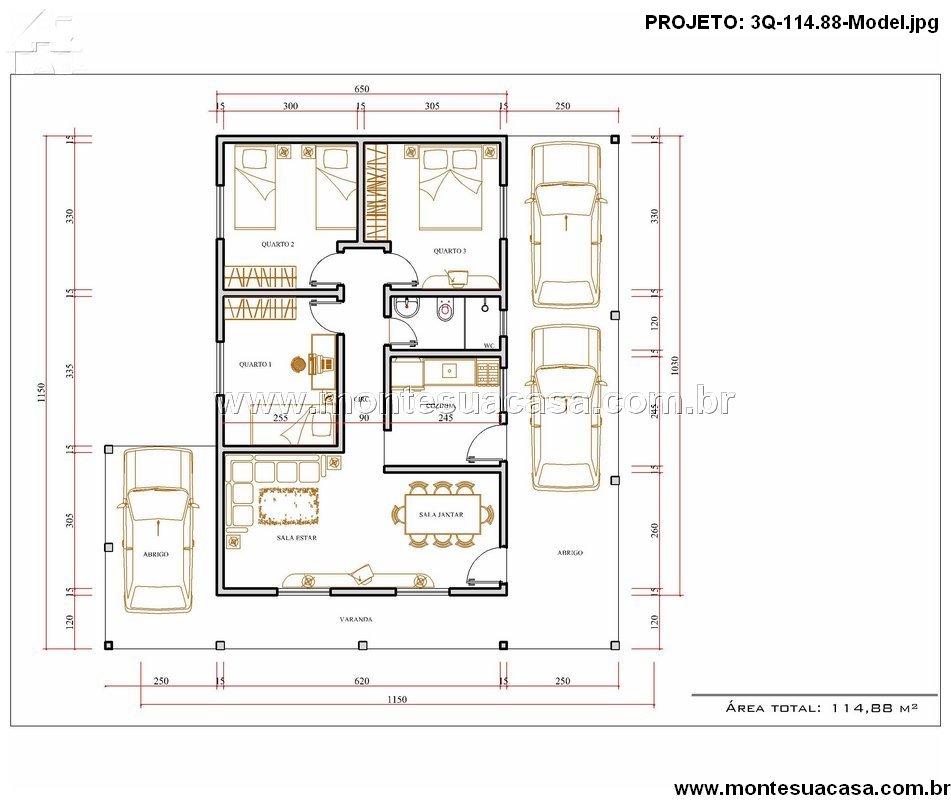 Este projeto de casa térrea com 114,88 m² combina funcionalidade, conforto e estilo contemporâneo em um layout que privilegia a integração dos ambientes e a praticidade no dia a dia. O design valoriza as linhas retas e a disposição inteligente dos cômodos, oferecendo uma moradia ideal para famílias que buscam equilíbrio entre estética e conforto.